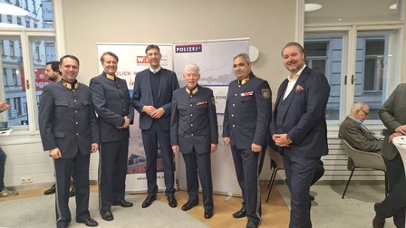 Foto v.l.n.r.: Stadthauptmann Klaus Schachner, Stadtkommandant Roman Friedl, BV Markus Figl, General Michael Lepuschitz, Rudolf Haas (Stv Einsatzleiter LPD Wien), Dieter Steup (WK Wien-Bezirksobmann)