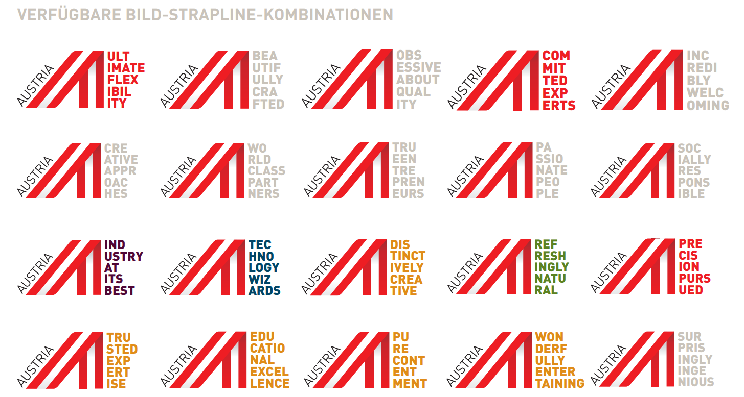 - Eine Veränderung der registrierten Wort-Bild-Marke, auf welche Art auch immer, ist unzulässig; dies umfasst auch Zusätze bzw. Ergänzungen zum Austria-A. Ebenso unzulässig ist die Einbindung, insbesondere das Voran- oder Hintanstellen, des Austria-A in z.B. Firmennamen, Logos, Unternehmenskennzeichen oder Ähnliches.