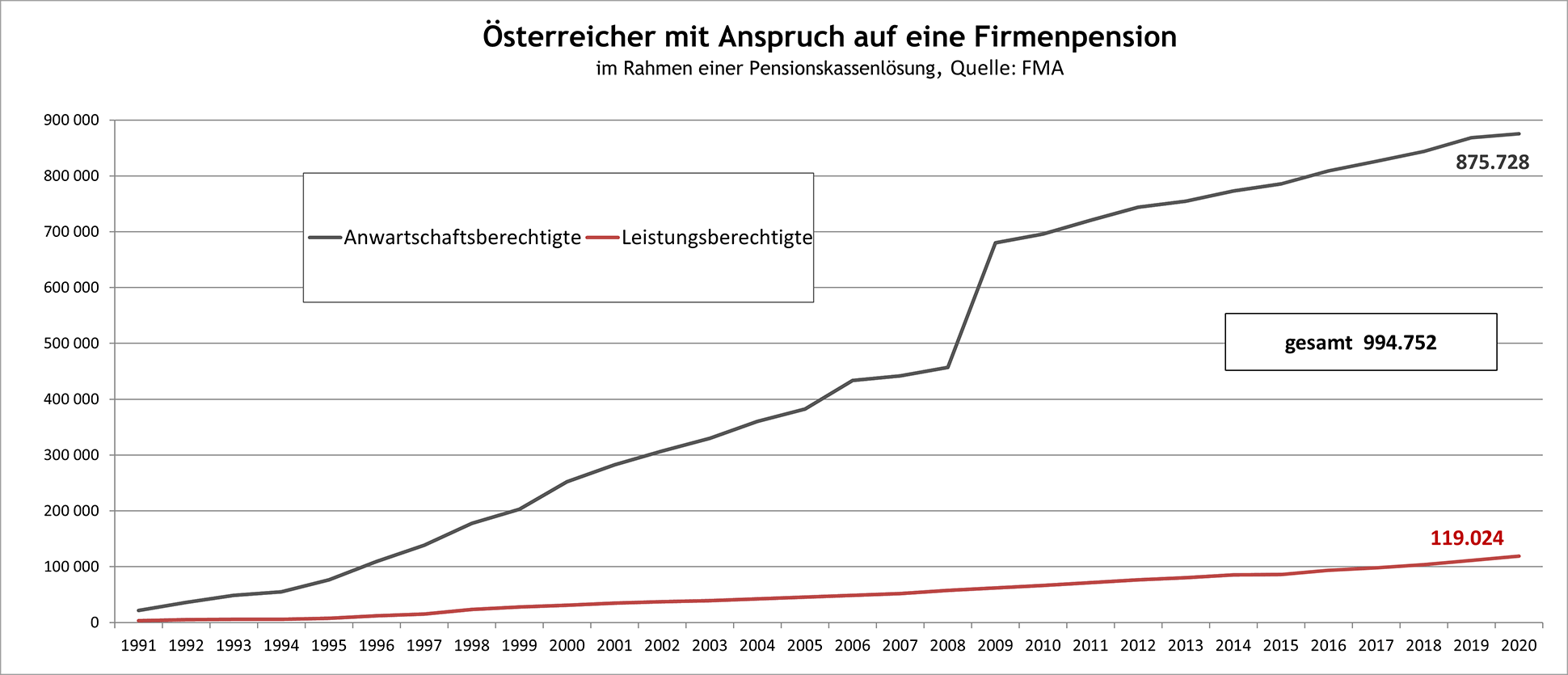 Mit Ende 2020 verwalten die acht Pensionskassen bereits ein Vermögen von 25,17 Mrd. Euro für mittlerweile mehr als 995.000 Personen. Die Pensionskassen sind seit Jahren der größte private Pensionszahler in Österreich.