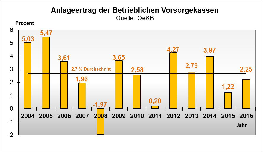 Die österreichischen Pensionskassen haben im Jahr 2016 ein Veranlagungsergebnis von durchschnittlich plus 4,18 Prozent für ihre Kunden erwirtschaftet und veranlagen 21,4 Milliarden Euro. Die Betrieblichen Vorsorgekassen mit ihrer konservativeren Veranlagung haben ein Veranlagungsergebnis von 2,25 % erreicht und verwalten 9,4 Milliarden Euro.