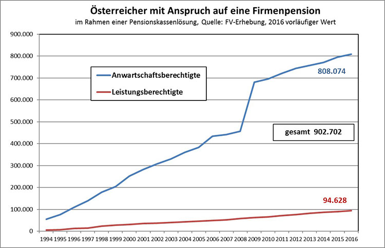 Derzeit haben mehr als 902.000 Österreicher (+ 2 Prozent im Vergleich zu 2015) Anspruch auf eine Firmenpension. Insgesamt veranlagten die 10 Pensionskassen im Jahr 2016 ein Vermögen von über 21,4 Mrd. Euro (+ 1,2 Mrd. Euro oder + 5 Prozent im Vergleich zu 2015). Damit sind sie der größte private Pensionszahler Österreichs. Die durchschnittliche Pension lag 2016 bei 499 Euro pro Monat.