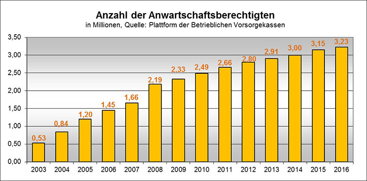 Die inzwischen mehr als 3,23 Millionen Anwartschaftsberechtigten setzen sich aus Arbeitnehmern, Unternehmern, Freiberuflern, Ärzten und Landwirten zusammen. Die Vorsorgekassen sind das einzige flächendeckende System kapitalgedeckter Vorsorge und bilden somit einen wichtigen Eckpfeiler als Ergänzung zur staatlichen Pension. Nach 14 Jahren Geschäftstätigkeit konnten die Vorsorgekassen das veranlagte Vermögen im Jahr 2016 um eine Milliarde steigern und verwalten nun bereits 9,4 Mrd. Euro. Diese Vermögenssteigerung konnte generiert werden, obwohl im Jahr 2016 bereits mehr als 440 Mio. Euro an Leistungen aus der Betrieblichen Vorsorge geflossen sind.
