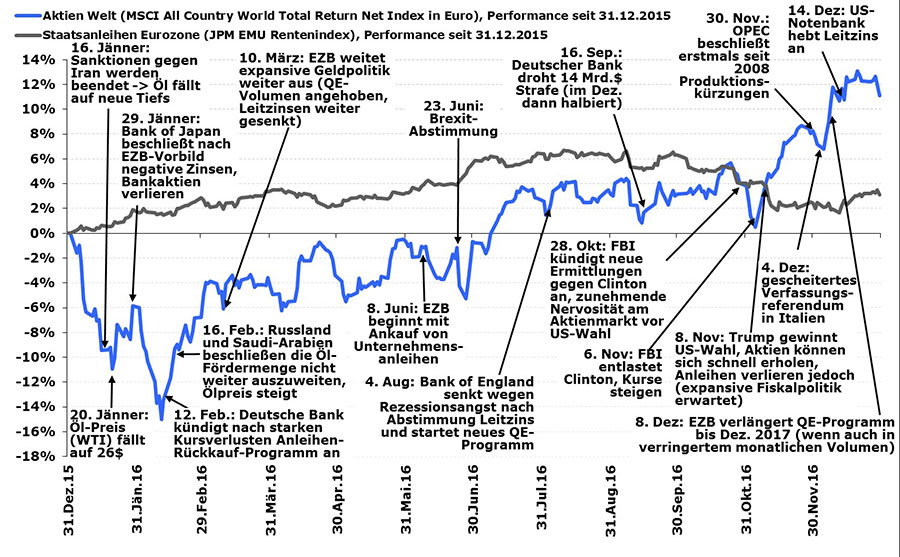 Das erste Halbjahr 2016 war mit dem Brexit und der damit verbundenen Unsicherheit sehr volatil und die Finanzmärkte sackten in Folge der Brexit Abstimmung in Großbritannien massiv ab. Das zweite Halbjahr verlief verhältnismäßig ruhig und ertragreich. Gleichzeitig hielten die Notenbanken aufgrund der durch die britische Abstimmung befürchteten wirtschaftlichen Unsicherheit weiterhin an ihrer sehr expansiven geldpolitischen Ausrichtung fest. So verschob die US-Notenbank erneut ihre schon länger geplante zweite Zinsanhebung. Gleichzeitig senkte die Bank of England nochmals die Zinsen und startete ein neues Quantitative Easing (QE)-Programm. Diese Kombination, aus besser als erwarteten Konjunkturdaten und vorerst weiter expansiver Geldpolitik, unterstützte die Finanzmärkte. Entgegen den Erwartungen setzte die EZB allerdings keine neuen monetären Akzente. So wurde weder der Leitzins nochmals gesenkt, noch gab es Entscheidungen, ob das aktuelle QE-Programm, das vorerst bis Ende März 2017 angesetzt ist, über die aktuelle Laufzeit hinaus verlängert wird. Die Aktienmärkte und Investitionen in Emerging Markets entwickelten sich im zweiten Halbjahr recht positiv.