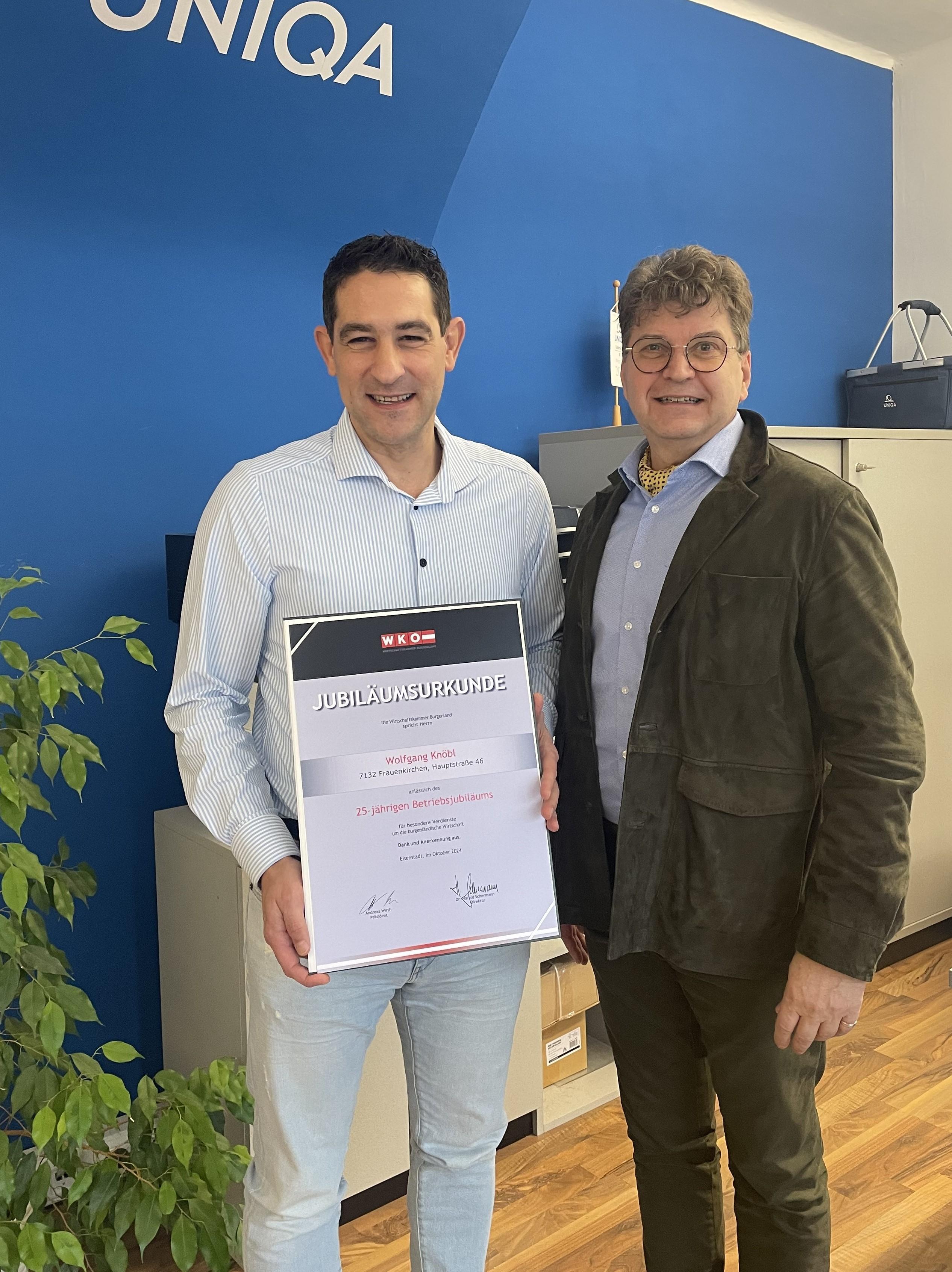 Anlässlich des 25-jährigen Betriebsjubiläums ehrte Klaus Duller, Obmann des Landesgremiums der Versicherungsagenten, den Firmenchef für seine Verdienste um die heimische Wirtschaft: „Wolfgang Knöbl ist ein Vorbild für unternehmerischen Erfolg in der Region.“