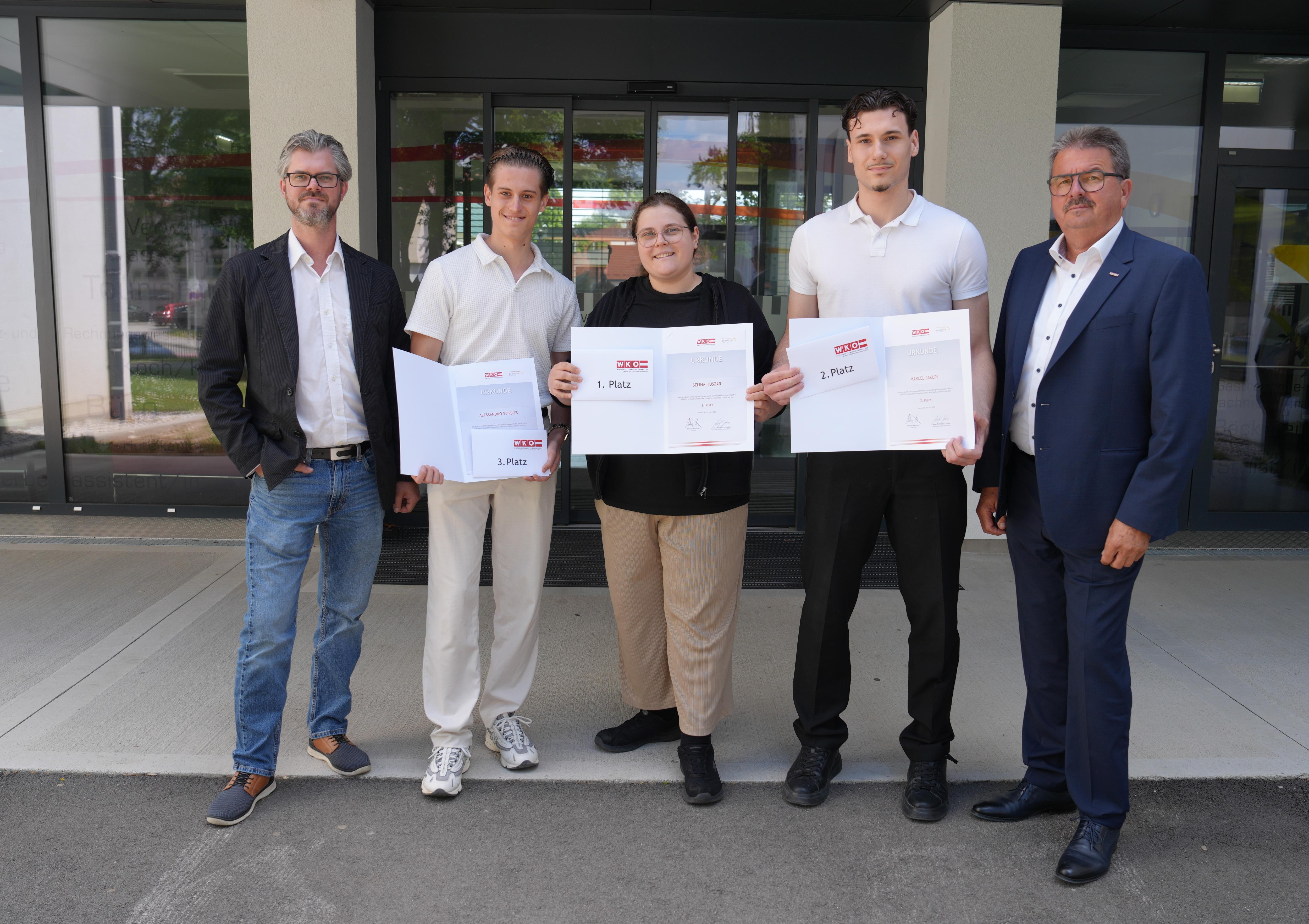 Philipp Reichart (Obmann des Landesgremiums des Elektro- und Einrichtungsfachhandels), Alessandro Stipsits (Drittplatzierter), Selina Huszar (Siegerin), Marcel Jakupi (Zweitplatzierter) und KommR Gerald Gurdet (Obmann-Stv.) (v. l.). // Foto © WKB