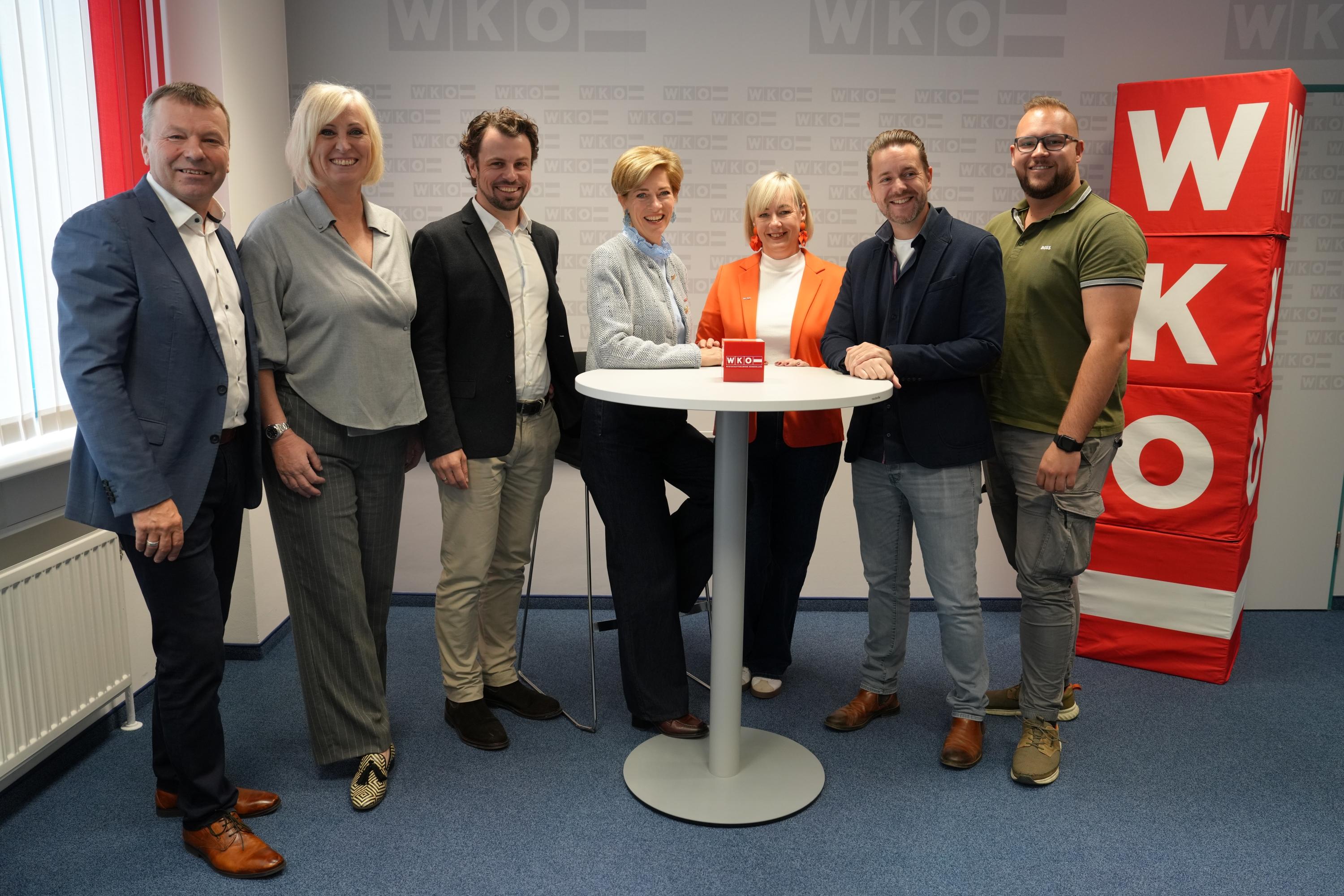 Landesvorsitzende Daniela Jagschitz (M.) mit den Bezirkssprechern Franz Erhardt (Oberpullendorf), Friederike Heinrich (Neusiedl am See), Johannes Schmit (Eisenstadt), Sabine Trinkl (Güssing), Thomas Paul (Oberwart) und Lukas Giefing (Mattersburg) (v. l.) // Foto © WKB