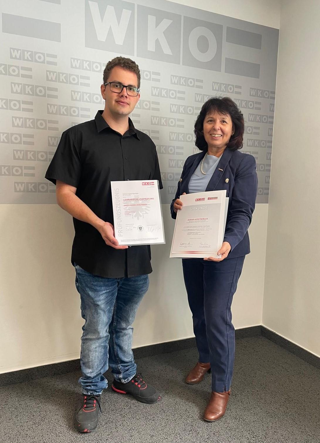 Dorian Kerstberger (Lehrbetrieb Baustoffgroßhandel Michael Koch Mattersburg) und Fachgruppengeschäftsführerin Martina Rauchbauer