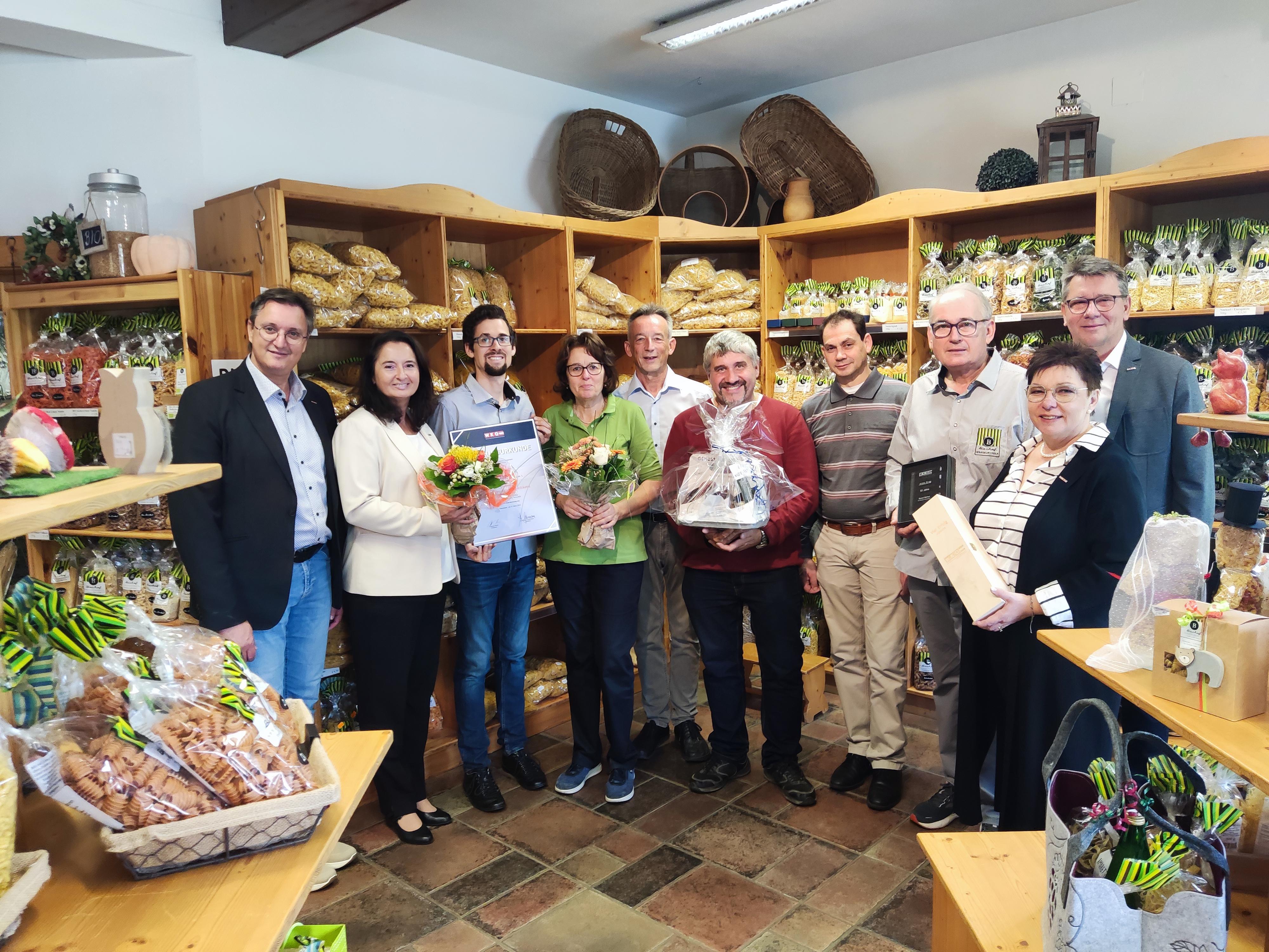 Regionalstellenleiter Thomas Novoszel, Innungsgeschäftsführerin Claudia Scherz, Lukas und Erna Bischof, Gerald Sagmeister, Innungsmeister Lebensmittelgewerbe KommR Thomas Hatwagner, Gemeindevorstand Martin Strobl, Innungsmeister-Stv. Winfried Bischof, Regionalstellenobmann Roman Eder und KommR Herta Walits-Guttmann (v. l.). // Foto © WKB
