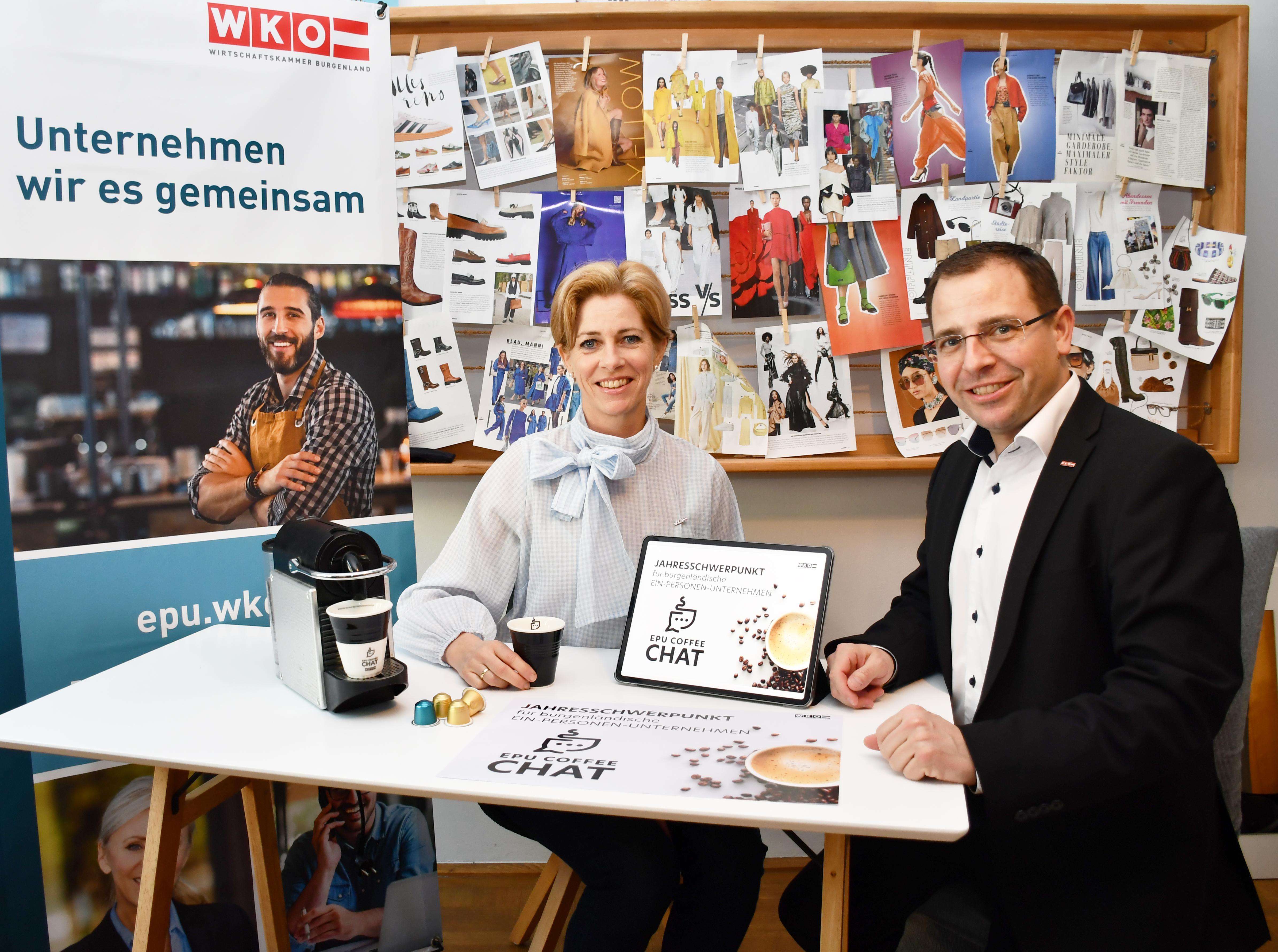 Wirtschaftskammerpräsident Andreas Wirth und EPU-Landessprecherin Daniela Jagschitz präsentieren die neue Online-Info-Kampagne „EPU-CoffeeChat“. // Foto © WKB