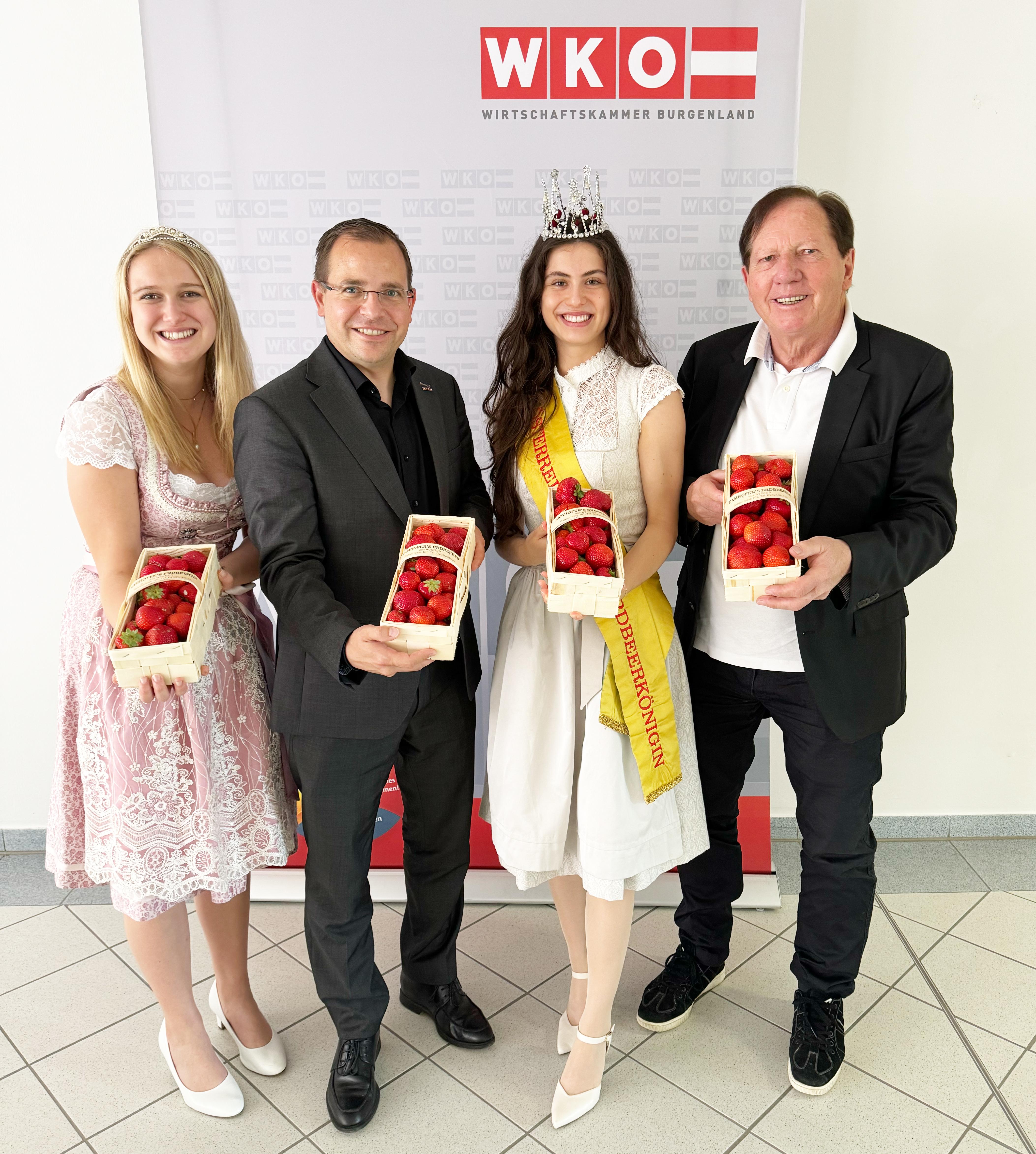Erdbeerprinzessin Elisa I., Wirtschaftskammerpräsident Andreas Wirth, Erdbeerkönigin Amelie I. und Wiesens Bürgermeister Matthias Weghofer (v. l.). // Foto © WKB