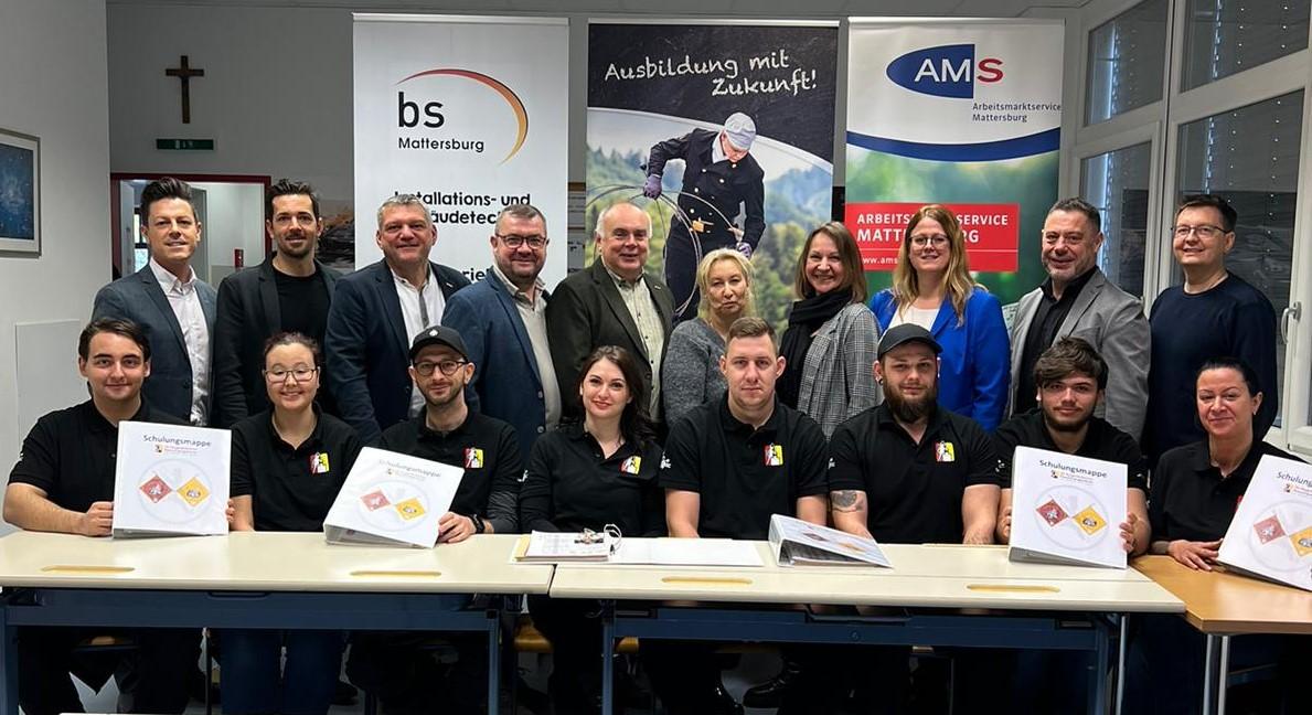Thomas Plank (Schulleiter), Anton Zolles (Innungsmeister-Stellvertreter), Herbert Baumrock (Innungsmeister), Roland Grieer (Ausbildungswart), Karl Tinhof (Fachgruppengeschäftsführer), Andrea Hametner (AGAN-Job konkret), Marlene Rottenschlager (AMS Mattersburg), Karin Steiner (AMS Burgenland Landesgeschäftsführerin-Stv.), Markus Plattner (Geschäftsstellenleiter AMS Mattersburg), Ernst Kornfeld (AMS Mattersburg) (stehend v. l.). // Foto © WKB