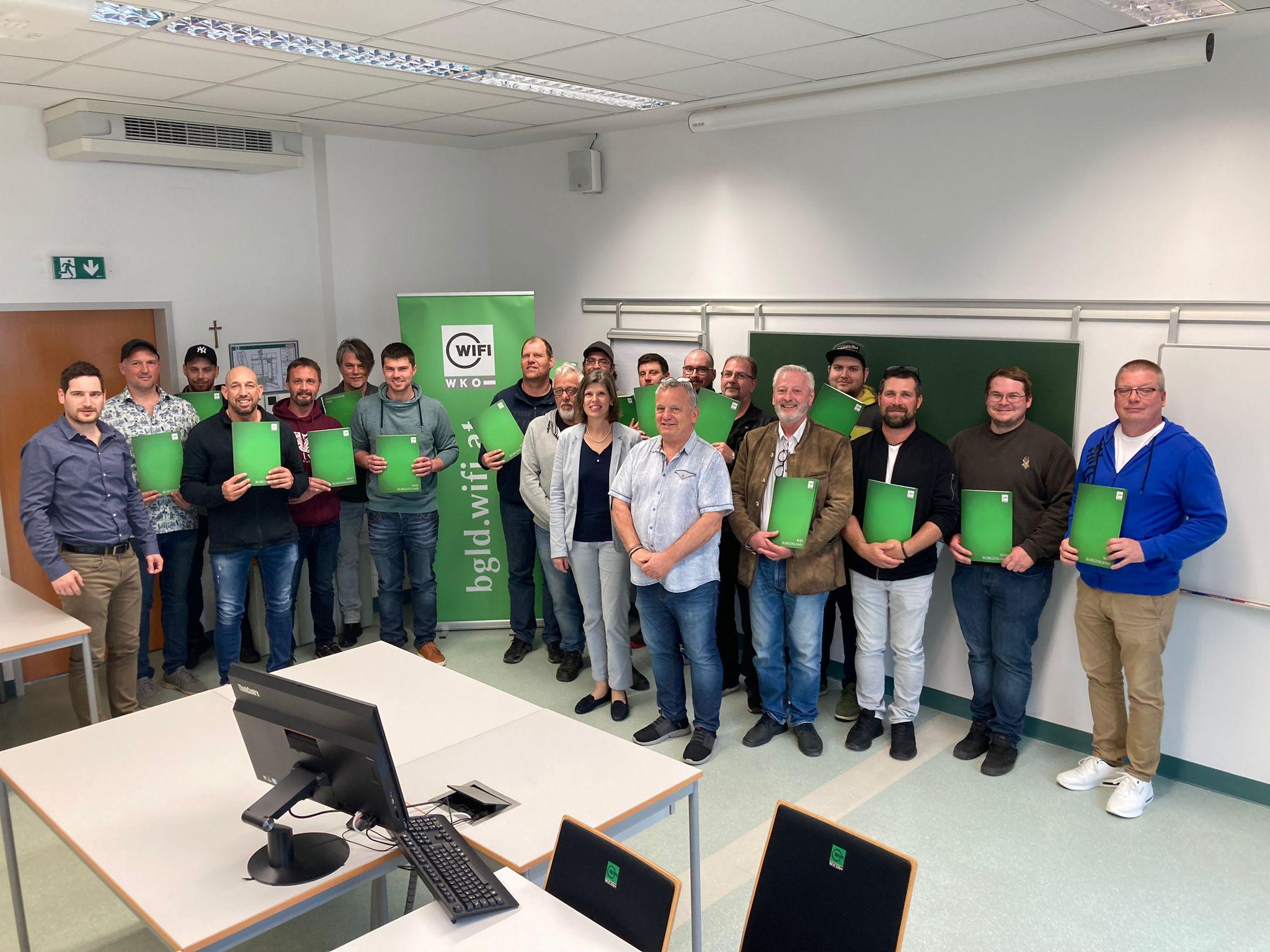 WIFI-Produktmanager Gerald Munzenrieder (l.), die Lehrgangsleiter Barbara Vanek (vorne 6. v. r.) und Peter Gisch (vorne 5. v. r.) mit den erfolgreichen Absolventen. // Foto © WKB