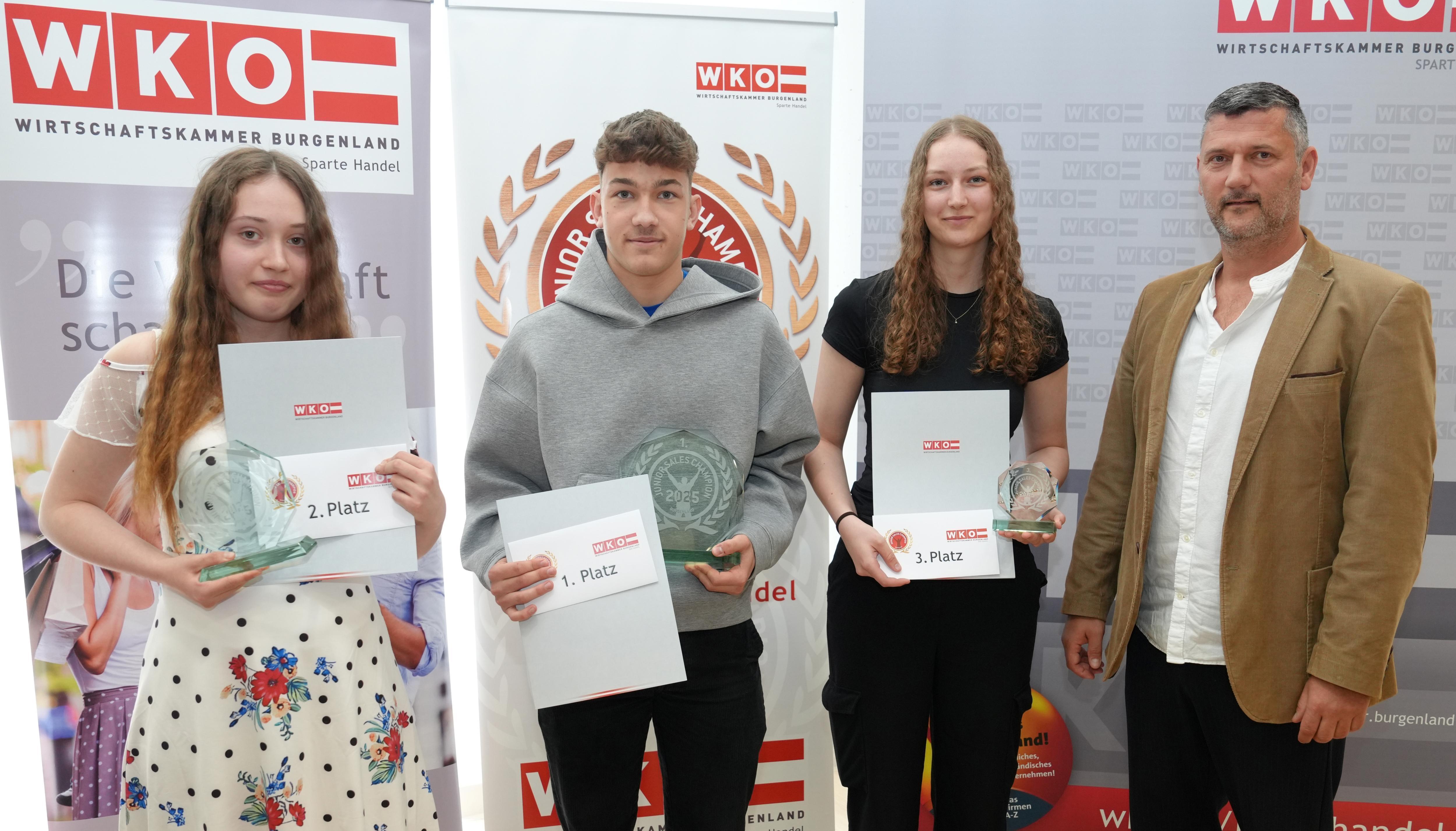 Die Drittplatzierte Sophie Tremmel (Lehrbetrieb Burgenland Energie AG, Eisenstadt), die Zweitplatzierte Jessica Goger (BAU & ARCHITEKTUR GmbH, Wolfau), Sieger Nico Andreas Freitag (Burgenland Energie AG, Eisenstadt) und René Mahlknecht (Obmann Landesgremium Maschinen- und Technologiehandel) (v. l.)
