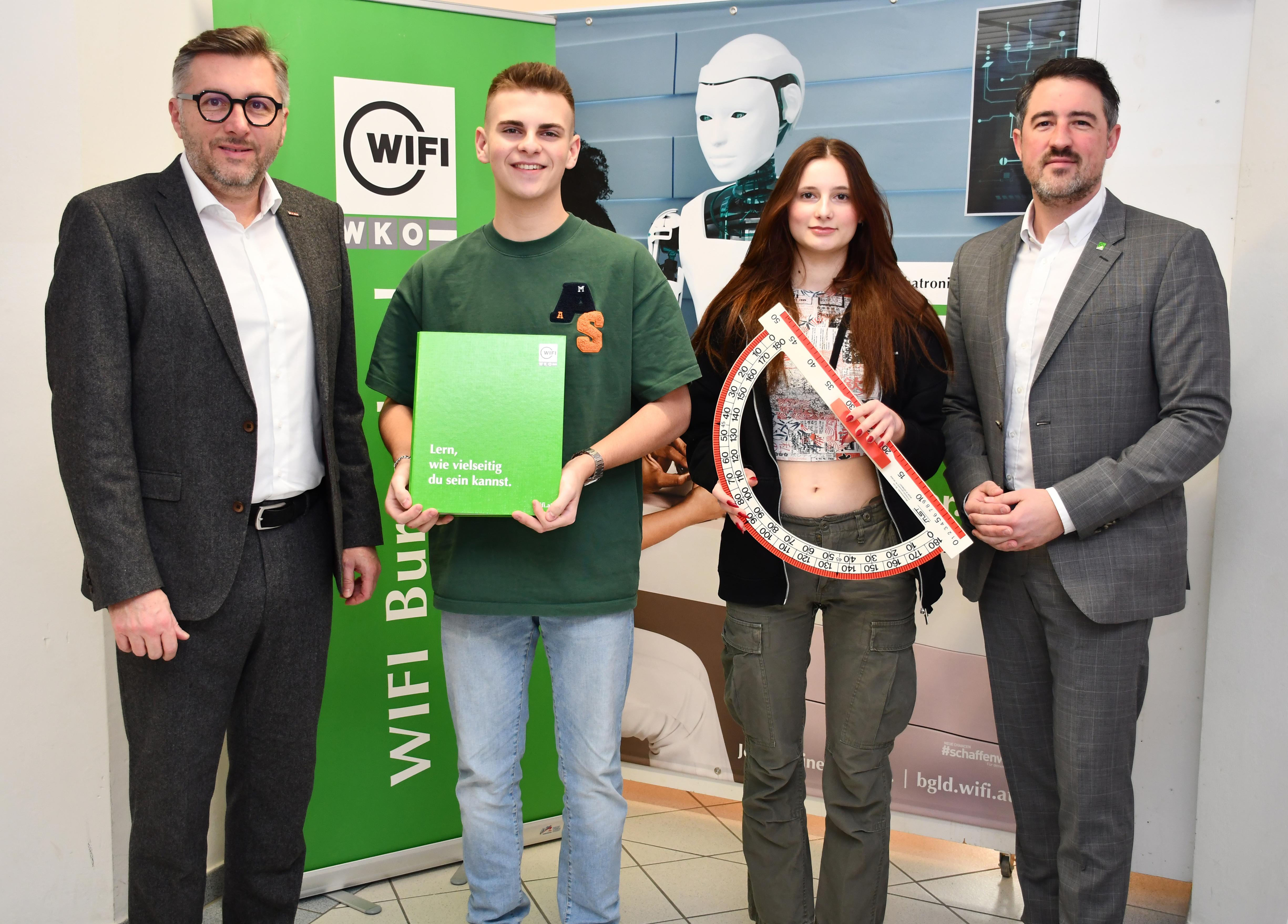Wirtschaftskammerdirektor Harald Schermann, die Lehrgangsteilnehmer Lukas Hofleitner und Catherina Halwachs sowie WIFI-Institutsleiter Thomas Jestl (v. l.). // Foto: © WKB