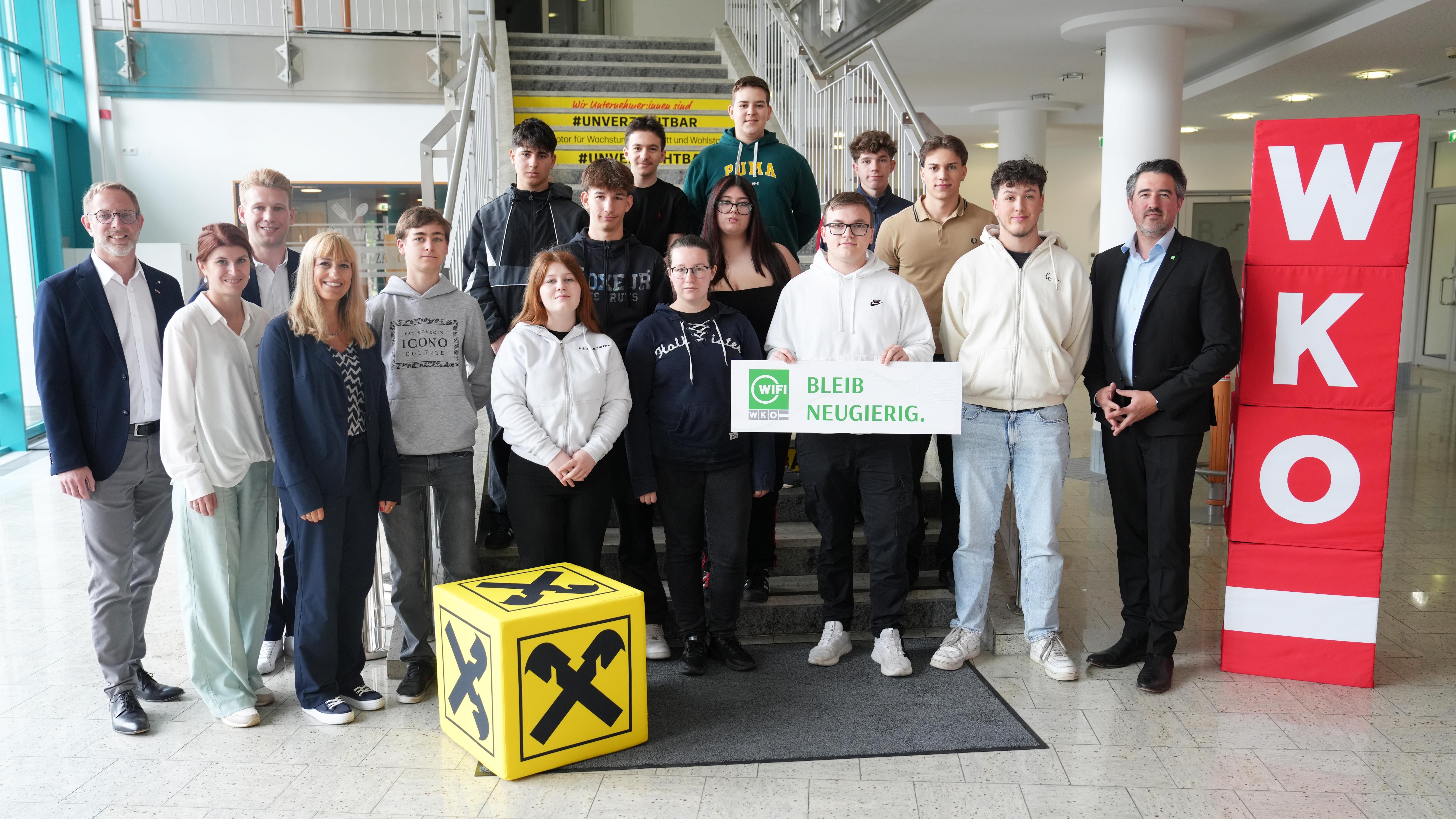 Ewald Hombauer (Spartengeschäftsführer Industrie), Catharina Ferencsak (WK), Patrick Pingitzer und Jutta Andre (Raiffeisenlandesbank Burgenland) (v. l.) sowie WIFI-Institutsleiter Thomas Jestl (r.) mit den Jugendlichen. // Foto © WKB