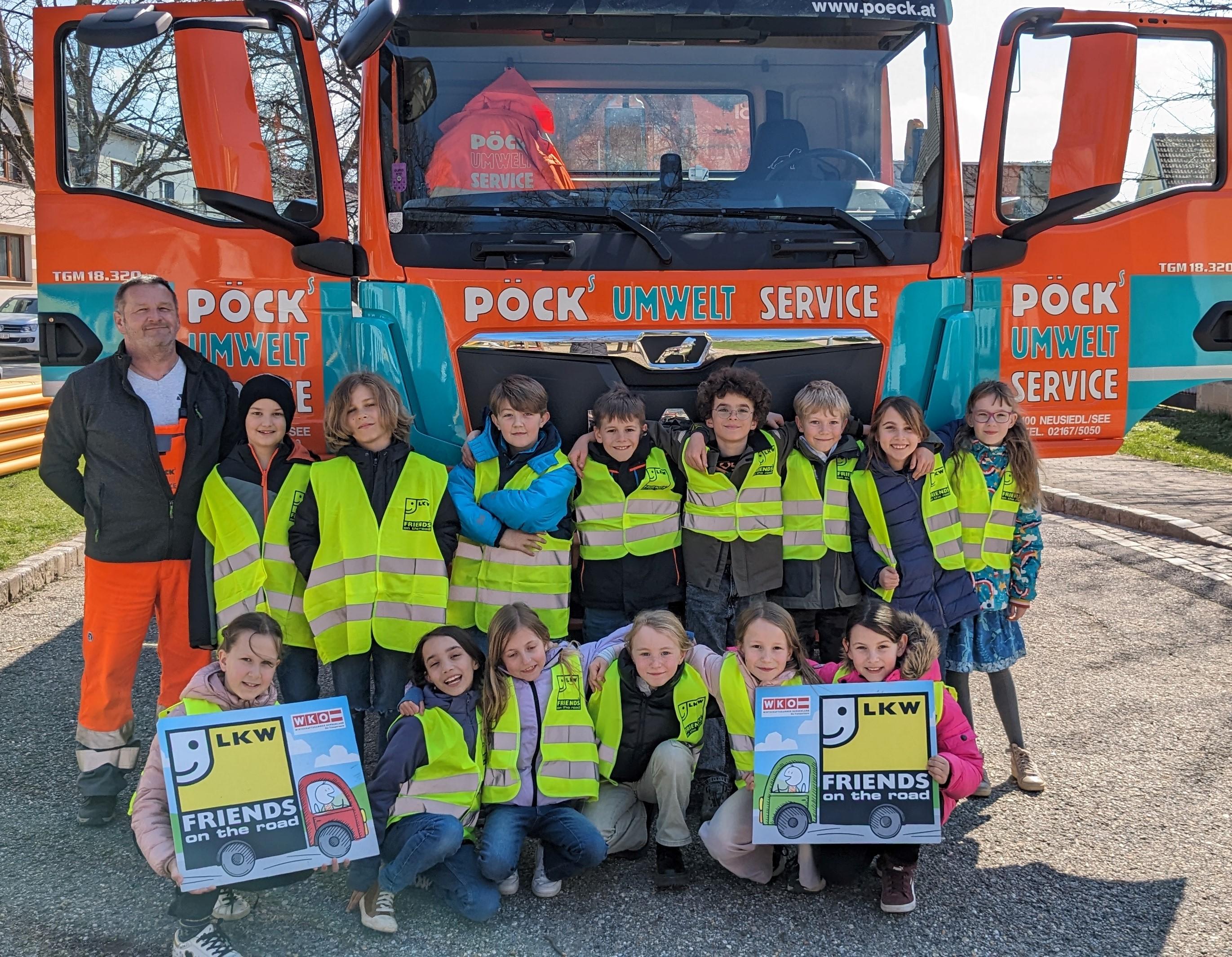 Lkw-Fahrer Johann Sattler (2. R. l.) mit den Kindern der 3a Klasse der Volksschule Weiden am See.