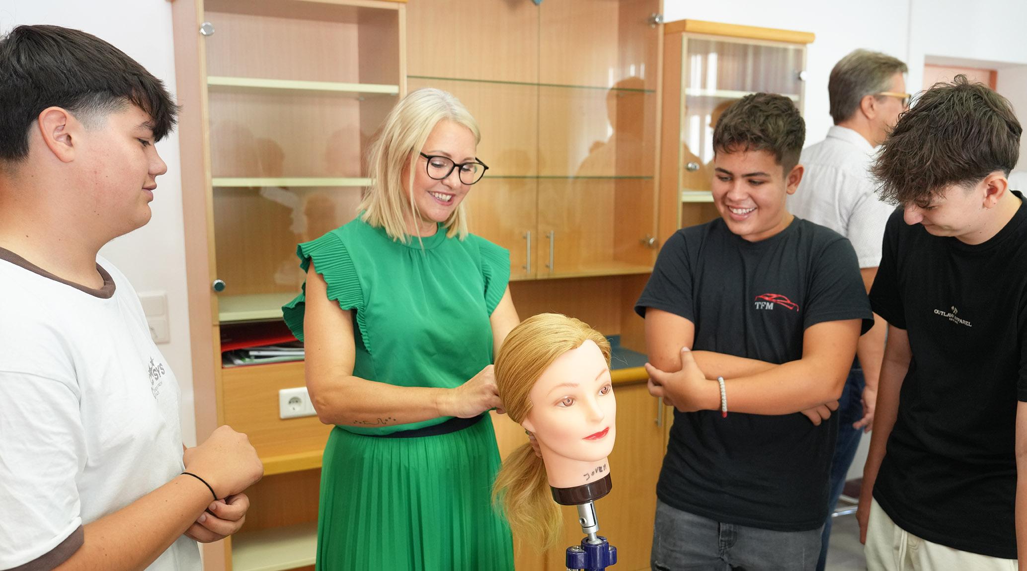 Das Angebot für die 49 Burschen umfasste die Berufe Friseur, Kosmetik, Floristik und Pflege. Mit großem Eifer wurde an den Puppenköpfen das Zopfflechten gelernt, Haare wurden geglättet und Locken gedreht.