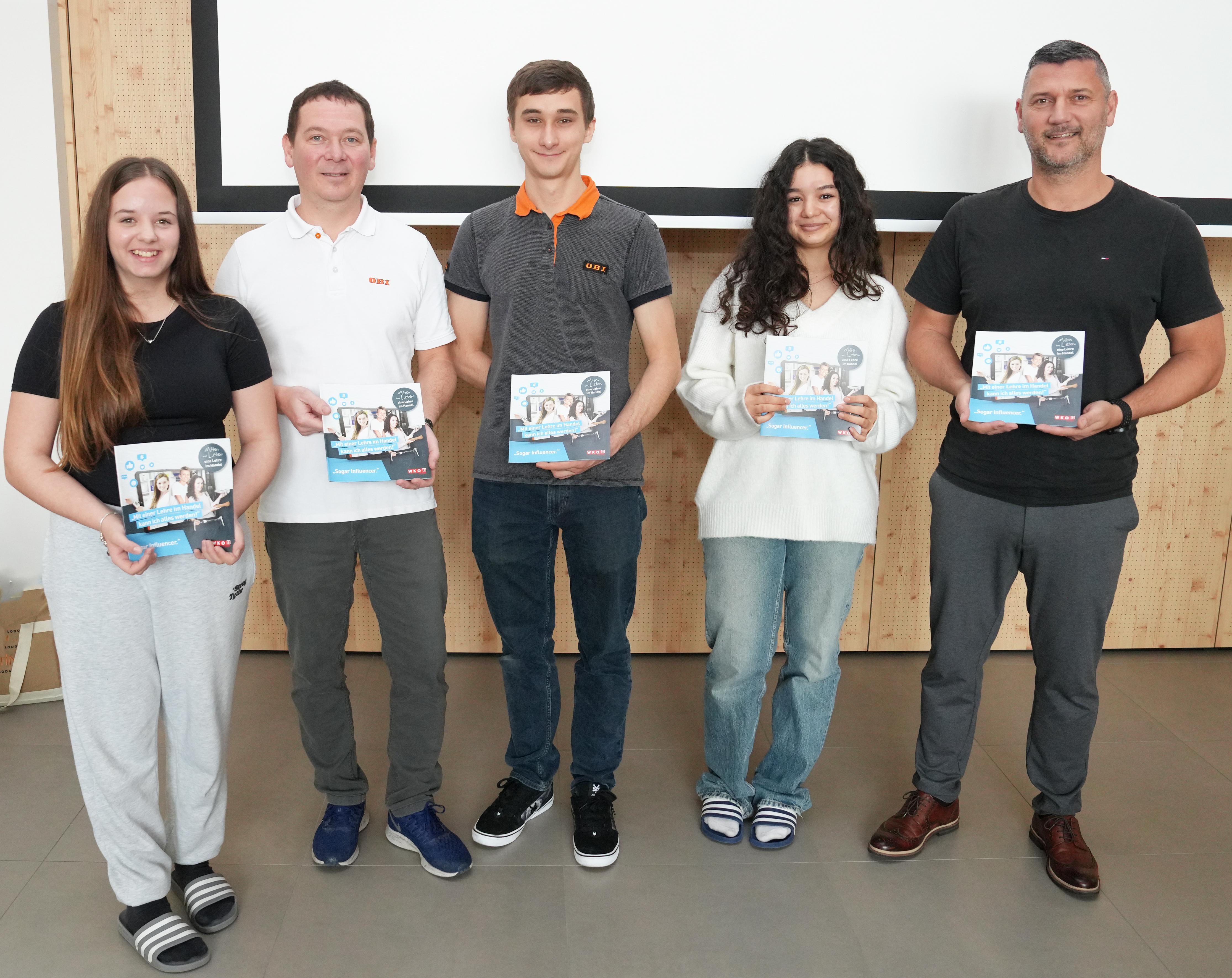 Carmen Fellinger (4a), OBI Mattersburg Marktleiter-Stv. Roland Schappelwein, Lehrling Andreas Lechner, Yaren Yapici (4a) und Rene Mahlknecht, Obmann des burgenländischen Maschinen- und Technologiehandels (v. l.).