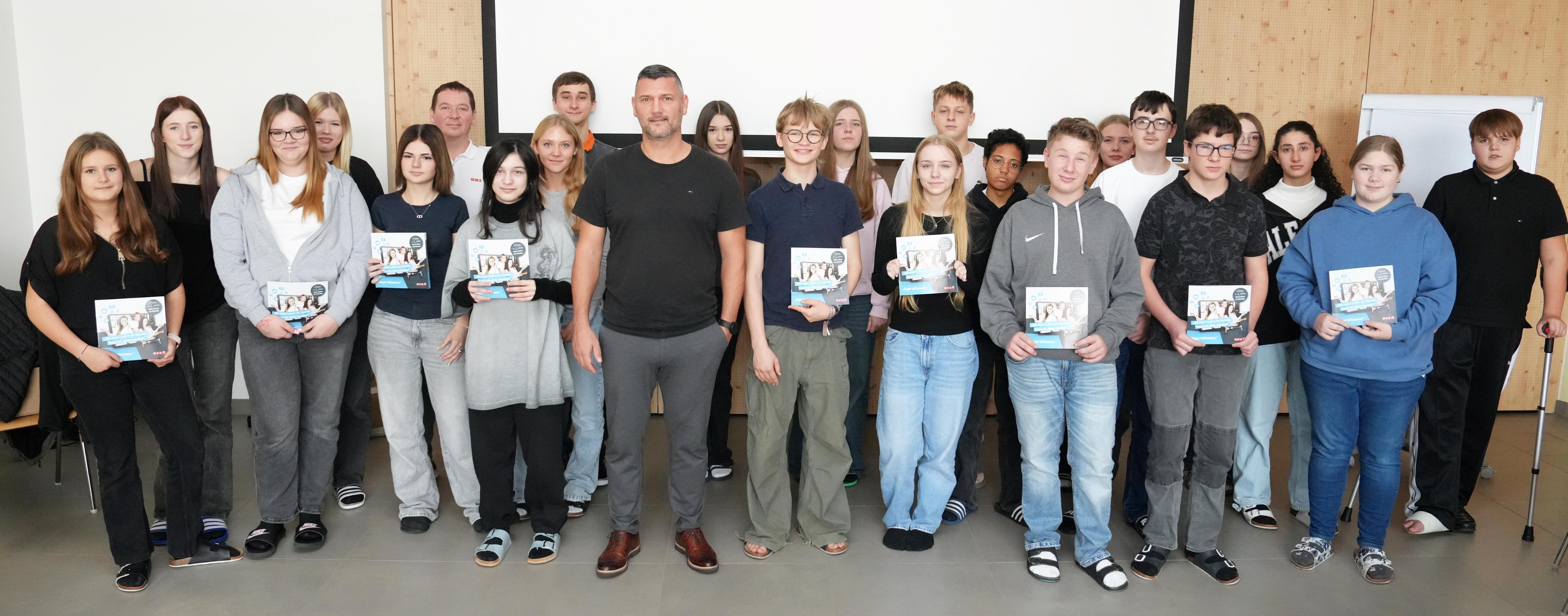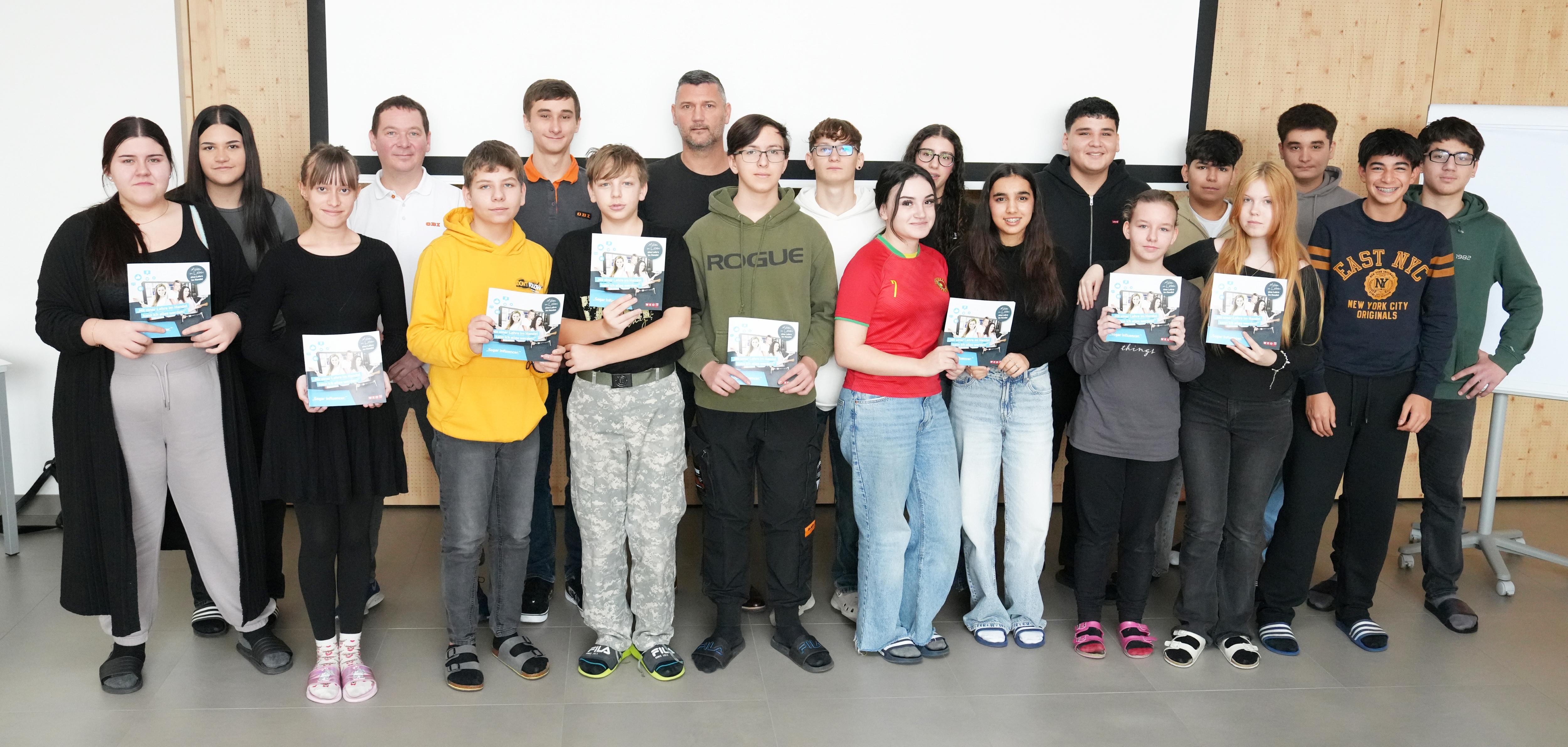 OBI Mattersburg Marktleiter-Stv. Roland Schappelwein, Lehrling Andreas Lechner und Rene Mahlknecht, Obmann des burgenländischen Maschinen- und Technologiehandels, (2. R. 2., 3. u. 4. v. l.) mit Schülerinnen und Schülern der 4b der MS Neudörfl.