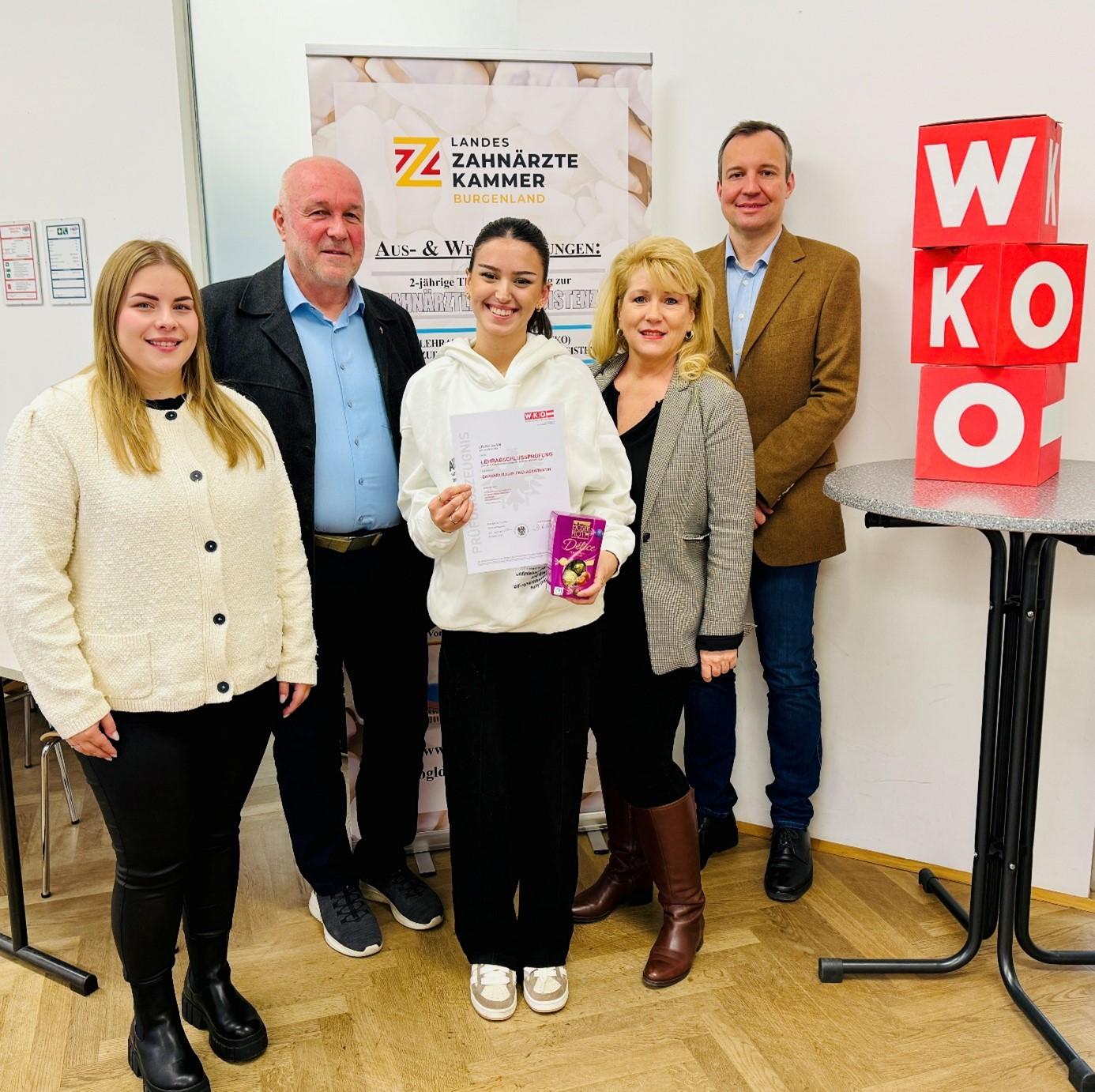 Katharina Maria Deutsch (AK), Dr. Ernst Michael Reicher (Präsident Landeszahnärztekammer Burgenland), Erlina Gashi, Petra Bischof-Oswald (WK) und Dr. Andreas Steiner (Landeszahnärztekammer Burgenland) (v. l.)