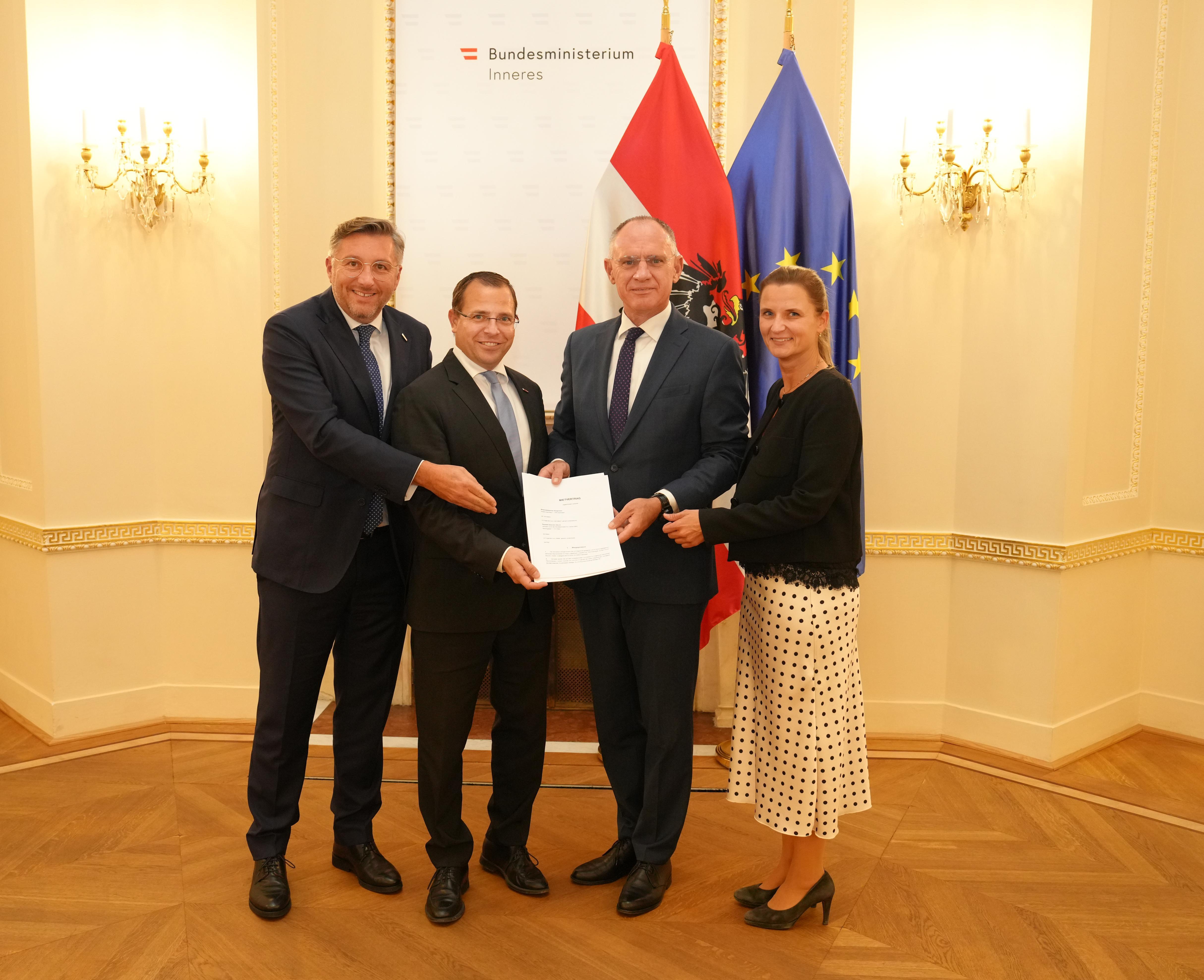 Wirtschaftskammerdirektor Harald Schermann, Wirtschaftskammerpräsident Andreas Wirth, Minister Gerhard Karner und Eva Gollubits, Leiterin Gruppe I/A (v. l.). // Fotos © WKB