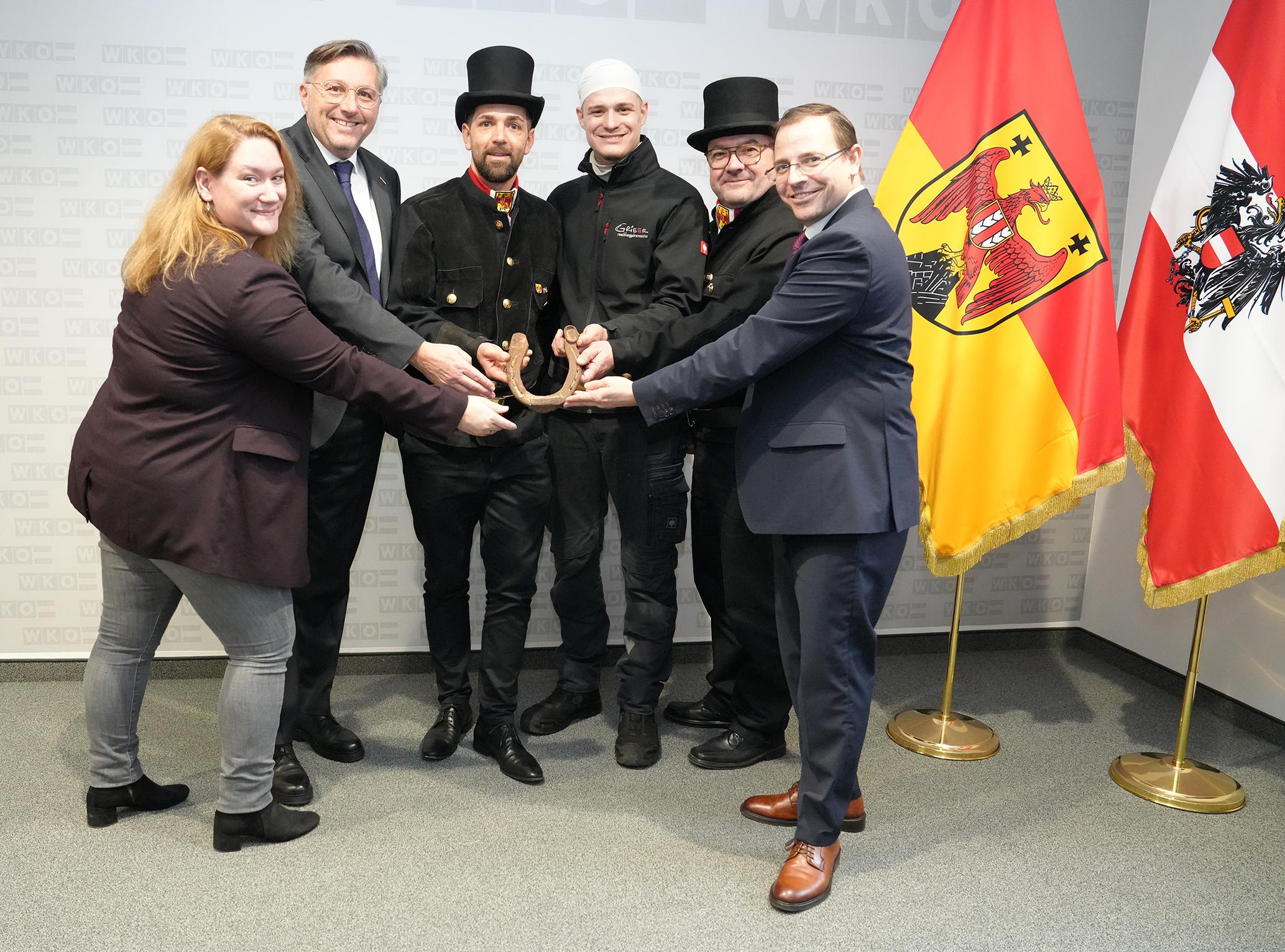 Am Bild: Carola Semeliker (WK), Wirtschaftskammerdirektor Harald Schermann, Landesinnungsmeister Mst. Anton Zolles, Geselle Kai Grieer, Landesinnungsmeister-Stv. Roland Grieer und Wirtschaftskammerpräsident Mst. Andreas Wirth (v. l.) // Foto © WKB