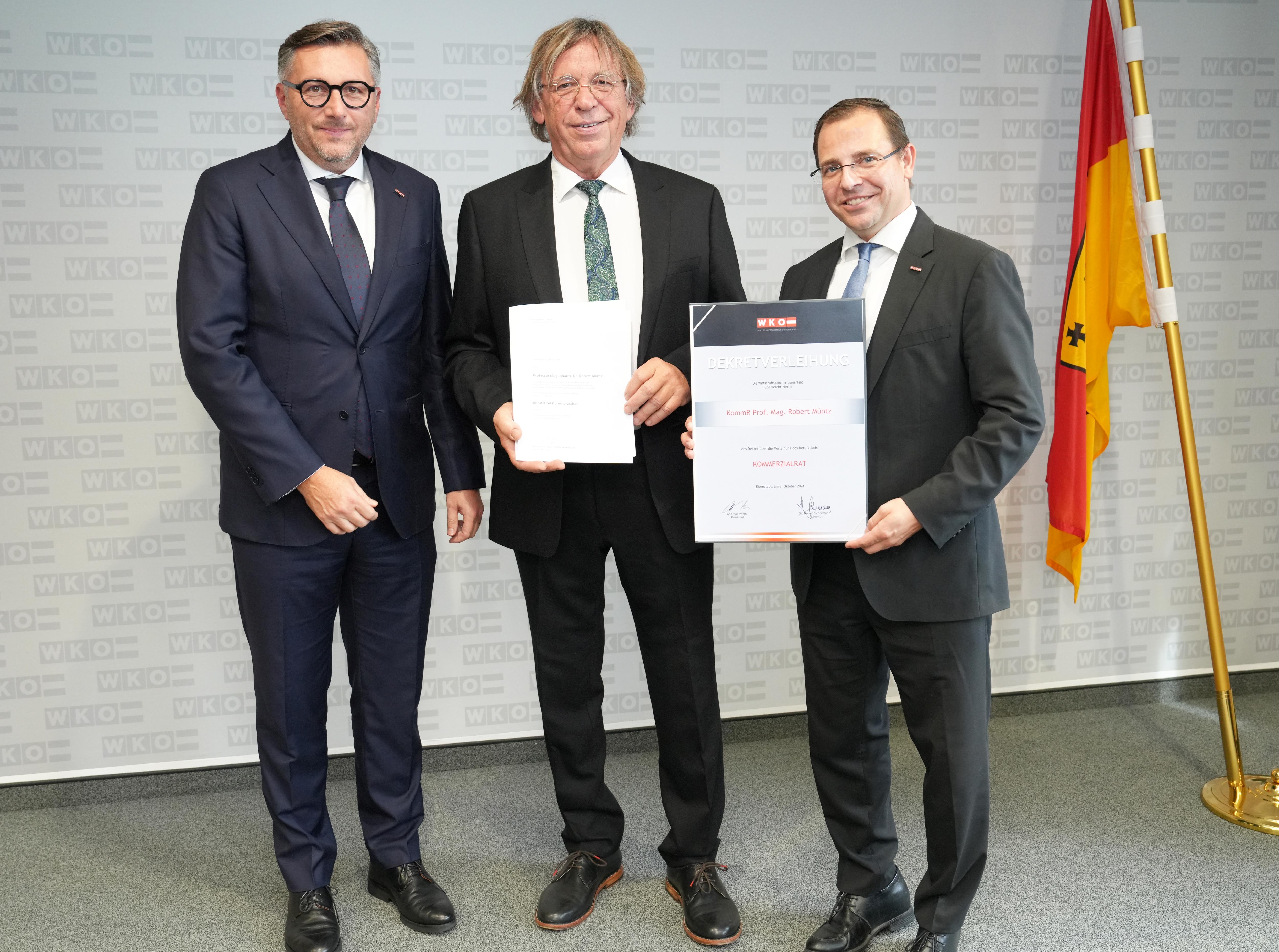 Wirtschaftskammerpräsident Andreas Wirth gratulierte: „Robert Müntz bringt sein Know-how als Top-Unternehmer und Unternehmensmanager in die burgenländische Wirtschaft ein. Seine langjährigen beruflichen Tätigkeiten in verschiedenen Positionen und Stationen sowie seine innovativen Ideen lassen ihn als ausgezeichneten Fachmann seiner Branche gelten. Sein imposanter Lebenslauf unterstreicht seine fachlichen und menschlichen Qualitäten sowie seinen Einsatz für die heimische Wirtschaft und die Gesellschaft. Robert Müntz ist ein verdienter Träger des Berufstitels ,Kommerzialrat‘.“