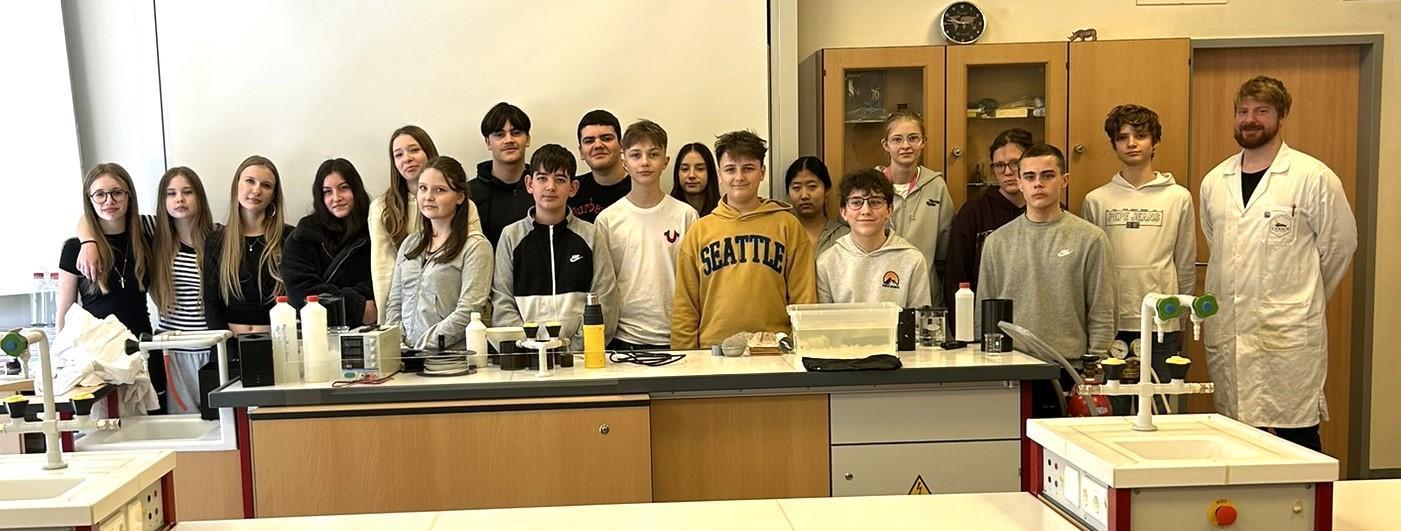 Vortragender Matthias Bergthaler (l.) mit Schülerinnen und Schülern der 3a-Klasse der Mittelschule Kittsee.
