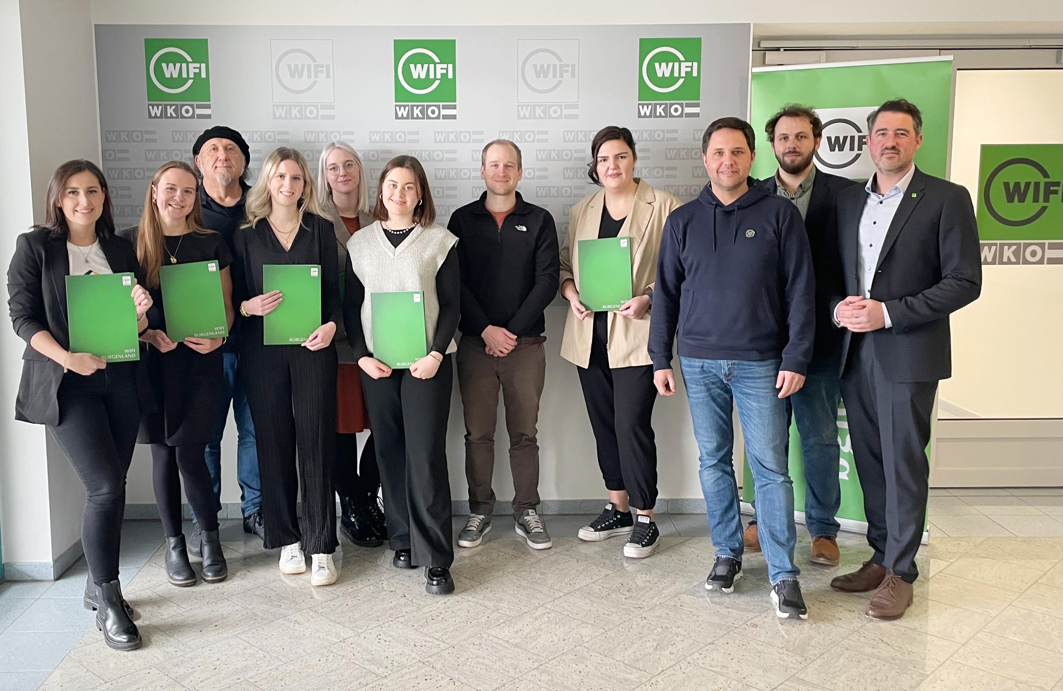 Beatrice Czumbil (Wr. Neustadt), Lena Lechner (Pitten), Lehrgangsleiter Luis Siegl, Anja Ehrenhöfer (Neustift an der Lafnitz), Laura Bierbaum (Schattendorf), Iris Reich (Bad Sauerbrunn), Trainer Sebastian Pachinger, Katarina Hanousek (Wulkaprodersdorf), Fachgruppenobmann Ronald Fenk, Oliver Stangl und WIFI-Institutsleiter Thomas Jestl (v. l.). // Foto © WKB