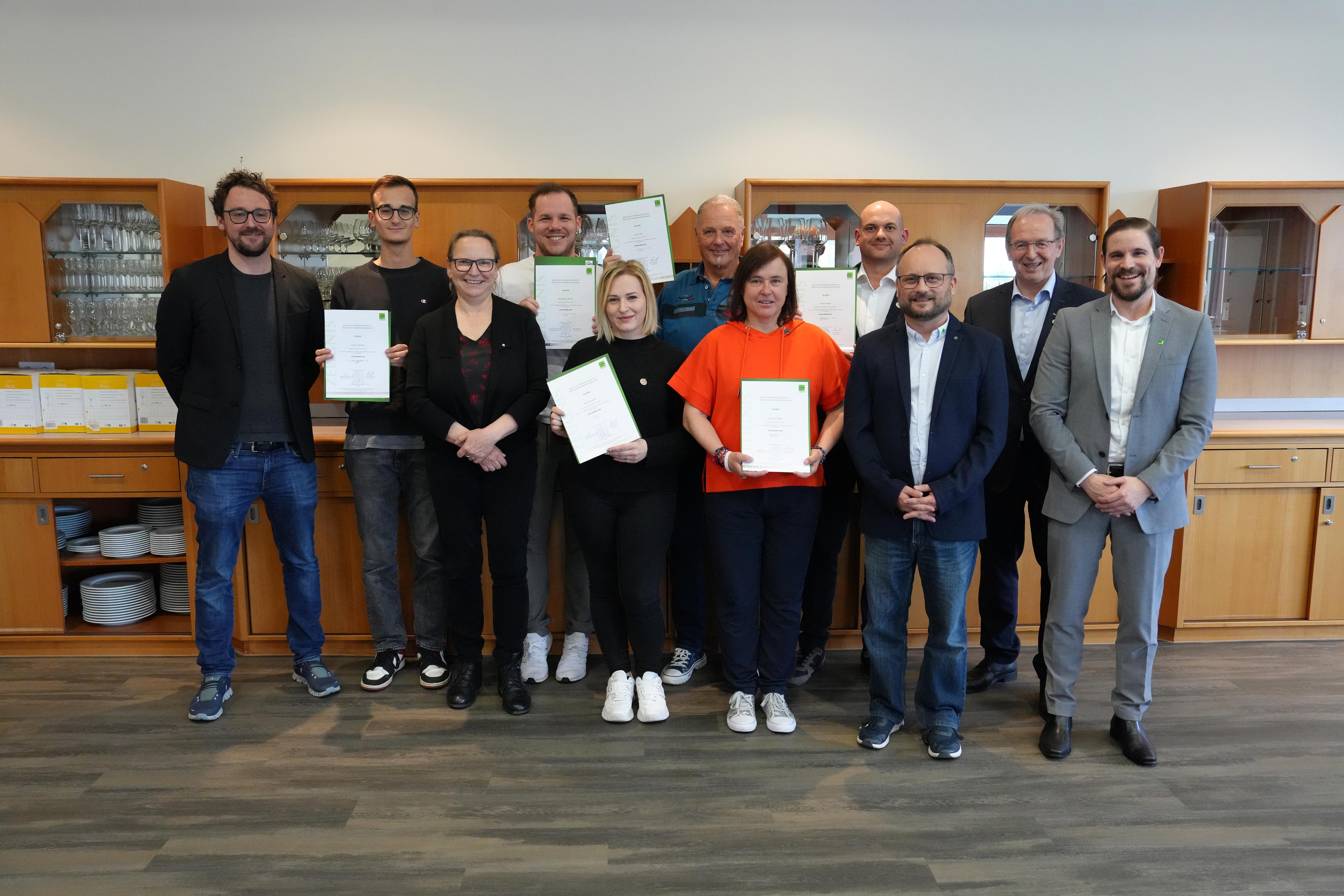 WIFI-Produktmanager Gerald Munzenrieder, WIFI-Institutsleiter Thomas Jestl, Lehrgangsleiter Johannes Einzenberger und Kursorganisator Andreas Knopf (stehend, v. l.) sowie die Teilnehmer Balint Balogh, Gerlinde Mayer (beide Eisenstadt), Heinz Toth, Nadine Wagner (beide Jois), Alexander Valentin (Ebreichsdorf) und Florian Spitaler (Terlan/Südtirol) (sitzend, v. l.). // Foto © WKB