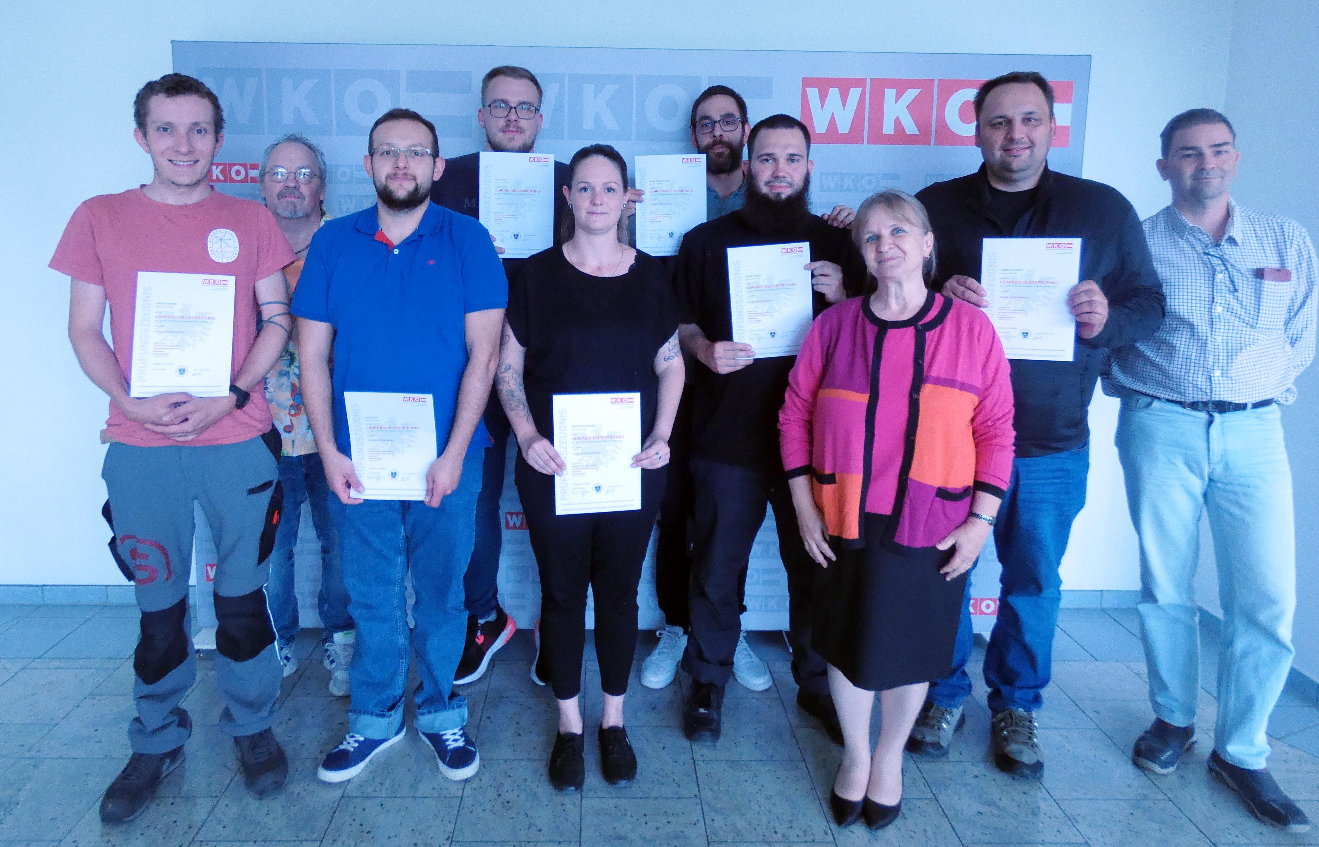 Am Bild: Marco Furtner (Wien), Sahin Sanli (Wien), Kerstin Weixelbaum (Oberschützen), Manuel Weber (Wien), KommR Mst. Marianne Jäger (Landesinnungsmeisterin der Chemischen Gewerbe und Denkmal-, Fassaden- und Gebäudereiniger), Andreas Spindler (Guntersdorf) und Beisitzer Bernhard Neubauer (1. R. v. l.);