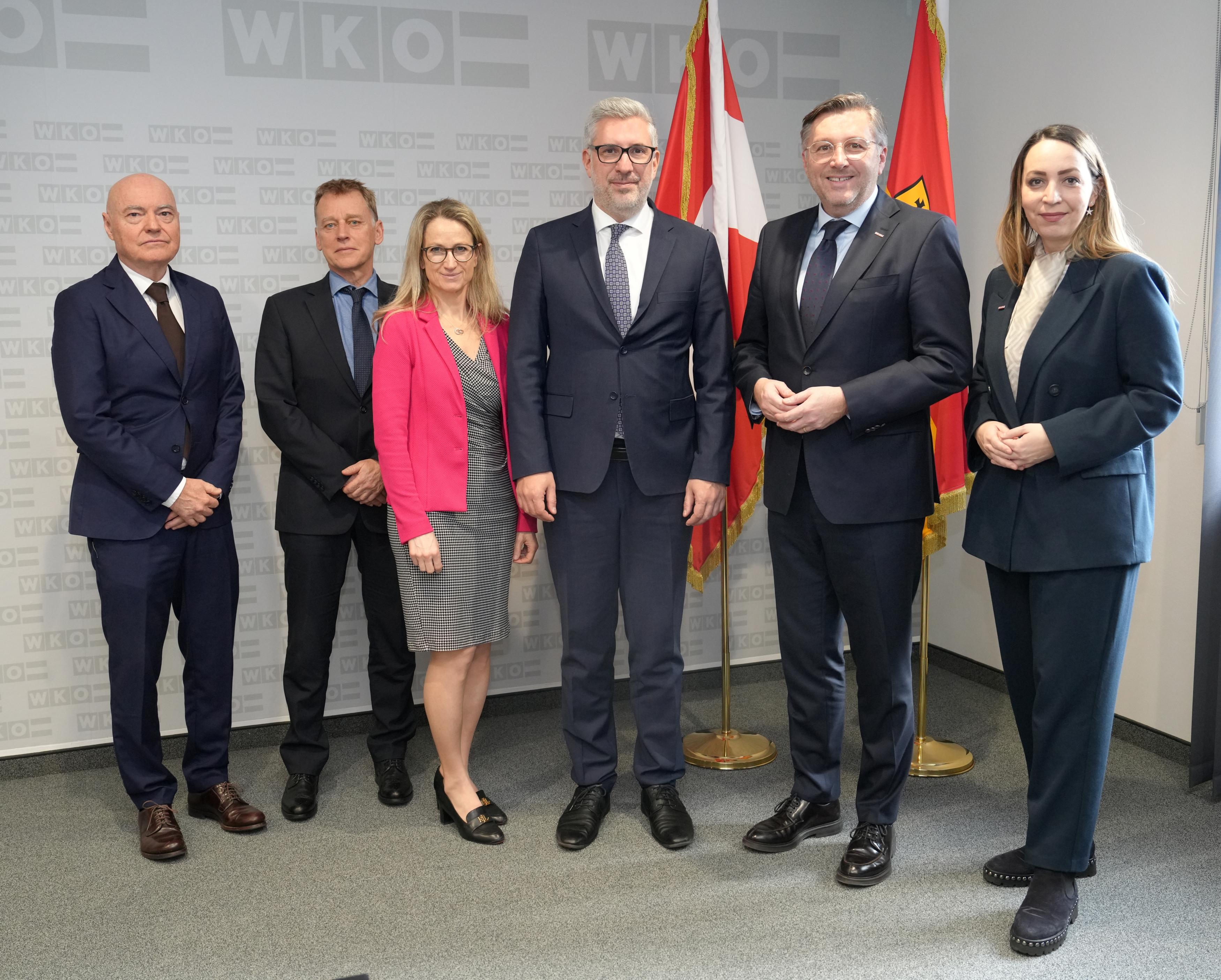 Peter Penkoff (Honorarkonsul Republik Slowenien im Burgenland), Marko Vrevc (Wirtschaftsrat Slowenische Botschaft), Barbara Kremžar (Stellvertreterin des Botschafters), Marko Štucin (Botschafter der Republik Slowenien in Österreich), Harald Schermann (Wirtschaftskammerdirektor) und Melanie Wagner-Deli (Leiterin AW & EU in der WK Burgenland) (v. l.) // Foto © WKB