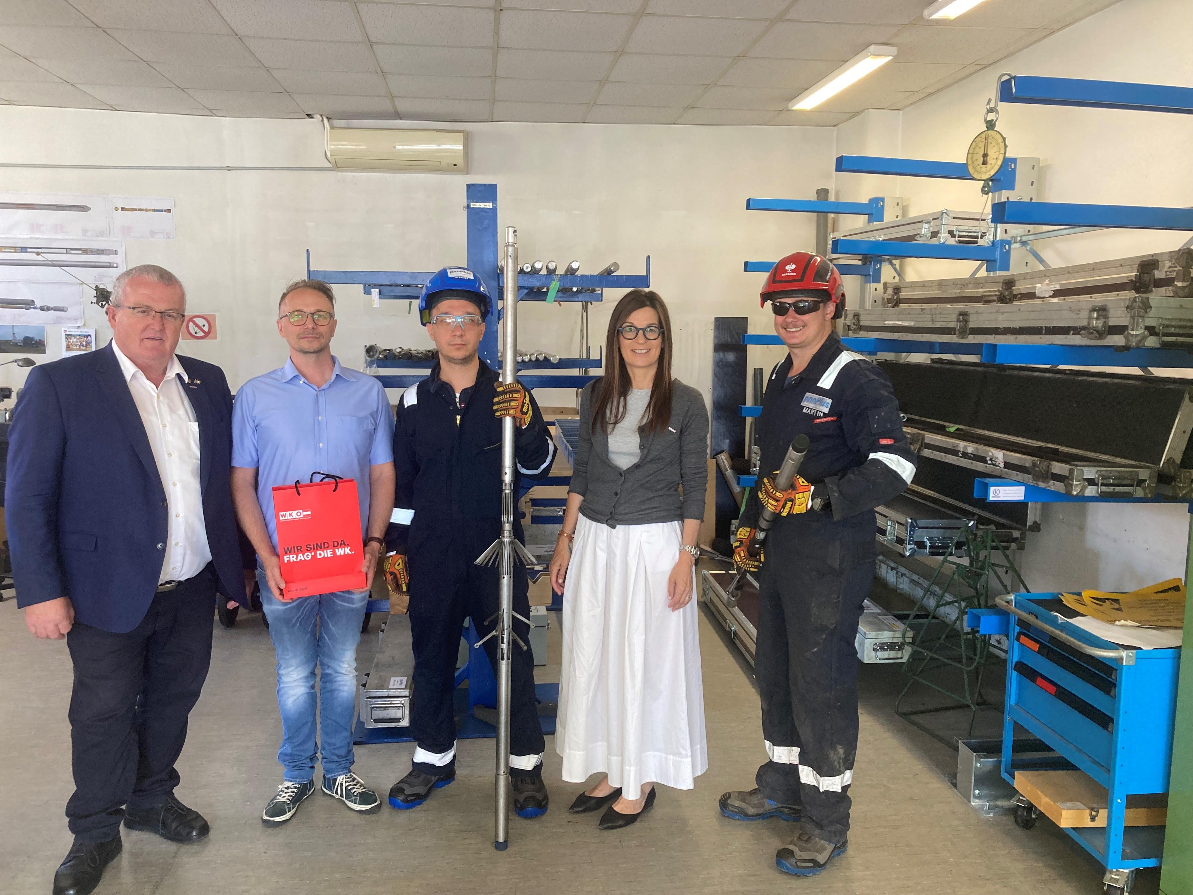 Landesinnungsmeister KommR MMst. Herbert Ohr, Ognjen Zajsek MSc (FH) (1. u. 2. v. l.), Innungsgeschäftsführerin Marlene Wiedenhofer (2. v. r.) mit zwei Mitarbeitern des Unternehmens. // Foto © WKB