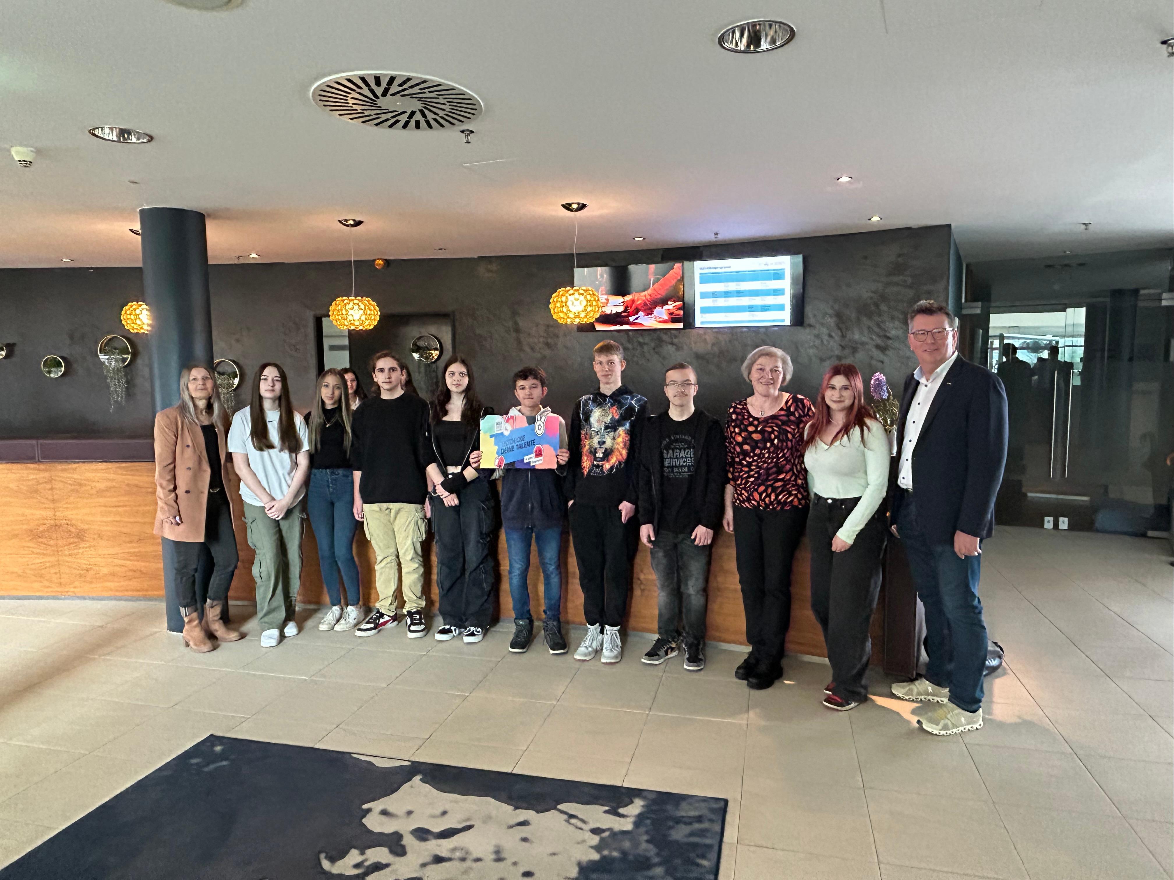 Falkensteiner Resort-Personalleiterin Martina Ernst (l.), Fachlehrerin Christine Brenner (3. v. r.) und Regionalstellenobmann Roman Eder (r.) mit Schülerinnen und Schülern der PTS Stegersbach.