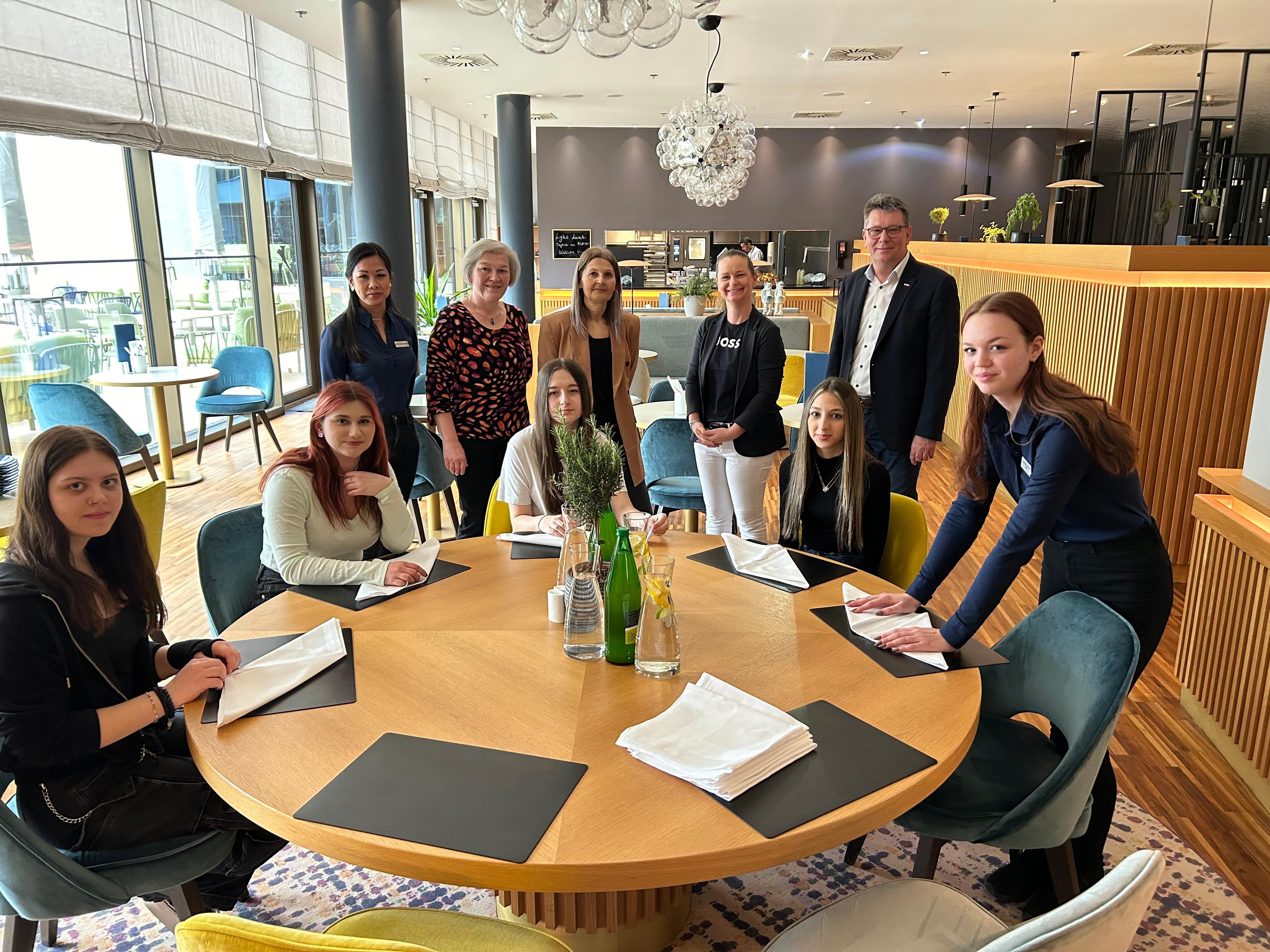 Hotel-Mitarbeiterin Grace Mendoza-Liebhardt, Fachlehrerin Christine Brenner, Falkensteiner Resort-Personalleiterin Martina Ernst, Frühstücksleiterin Susanne Windhaber, Regionalstellenobmann Roman Eder und Hotel-Mitarbeiterin Helene Janisch mit Schülerinnen der PTS Stegersbach.