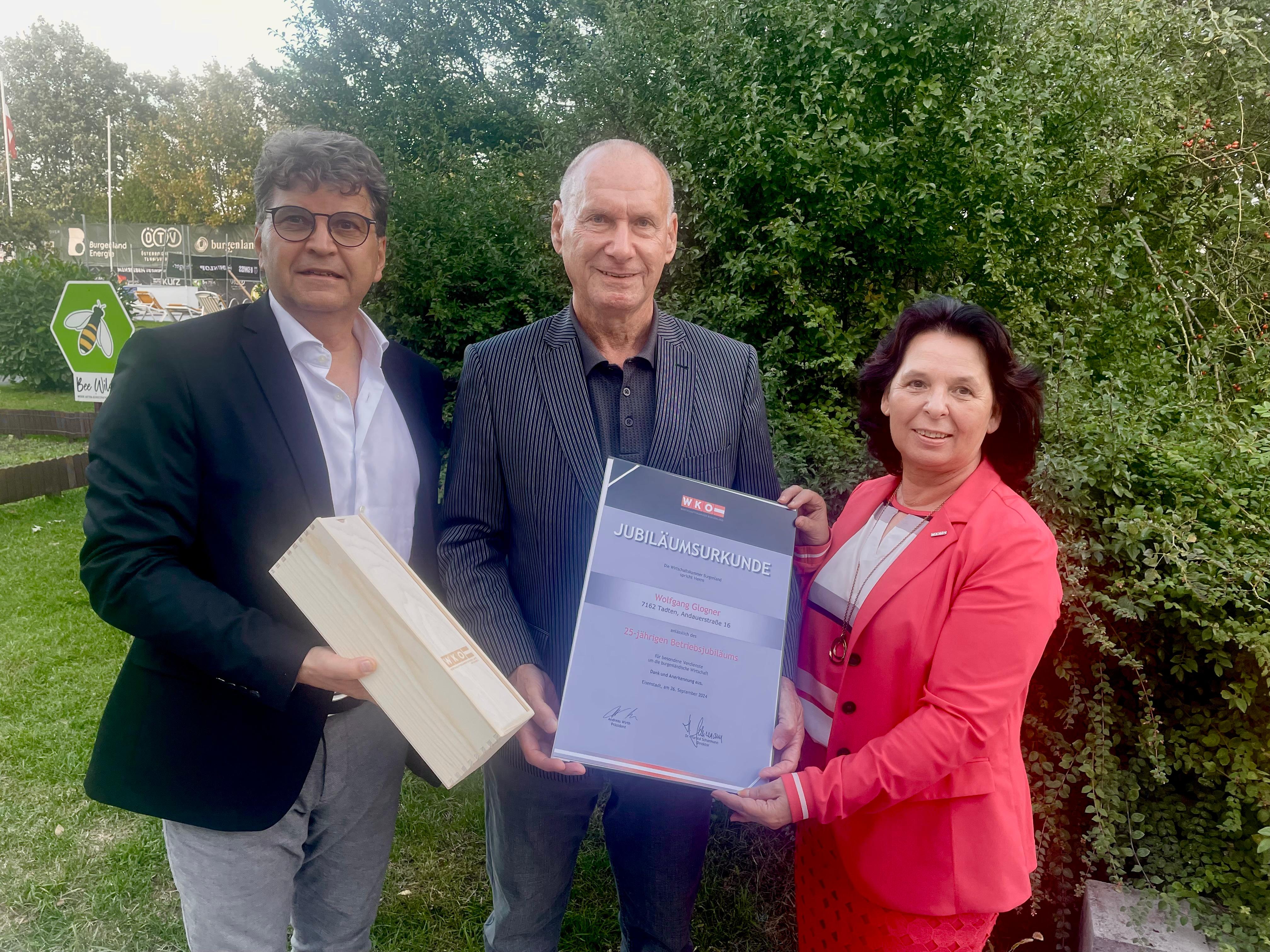 Im Rahmen der Tagung gratulierten Obmann Klaus Duller und Fachgruppengeschäftsführerin Martina Rauchbauer, Wolfgang Glogner zum 25-jährigen Firmenjubiläum. Der in Tadten ansässige Unternehmer begann seine Karriere in der Versicherungsbranche schon vor 50 Jahren. Nach einer erfolgreichen Laufbahn als Angestellter entschied er sich für die Selbständigkeit als Versicherungsagent. „Nicht nur das Versicherungsprodukt, sondern auch ein entsprechendes Service gegenüber den Kundinnen und Kunden sind ein wesentlicher Bestandteil, um erfolgreich zu sein. Eine so langjährige Tätigkeit in der Branche erfordert, Veränderungen mitzutragen und sich anzupassen“, betont Duller in seiner Rede.