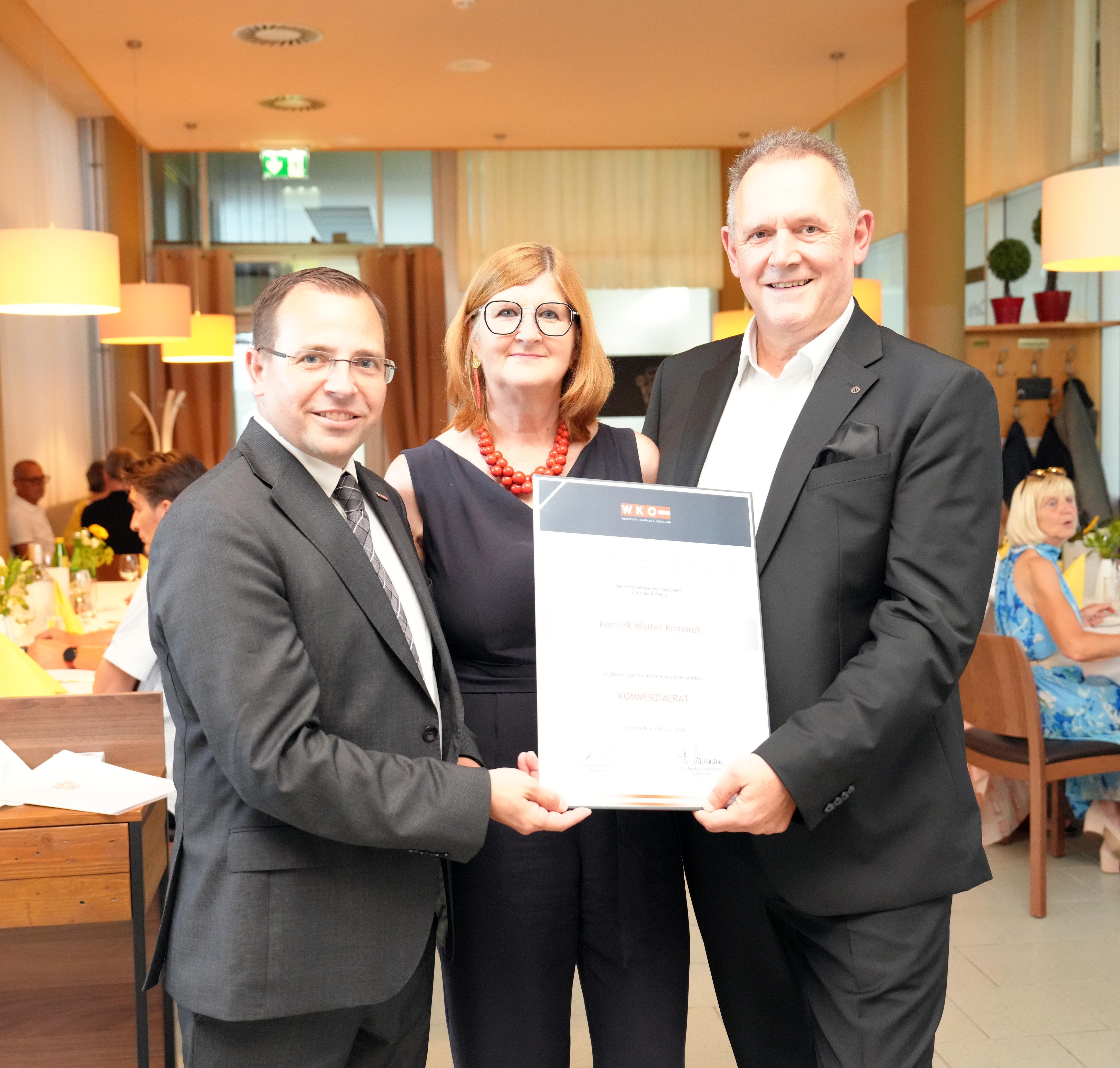 Wirtschaftskammerpräsident Andreas Wirth gratuliert: „Walter Komarek ist ein hervorragender Unternehmer, seine erfolgreiche Karriere und seine Arbeit als Interessenvertreter machen ihn zum ausgezeichneten Fachmann seiner Branche. Er ist ein verdienter Träger des Berufstitels ,Kommerzialrat‘.“