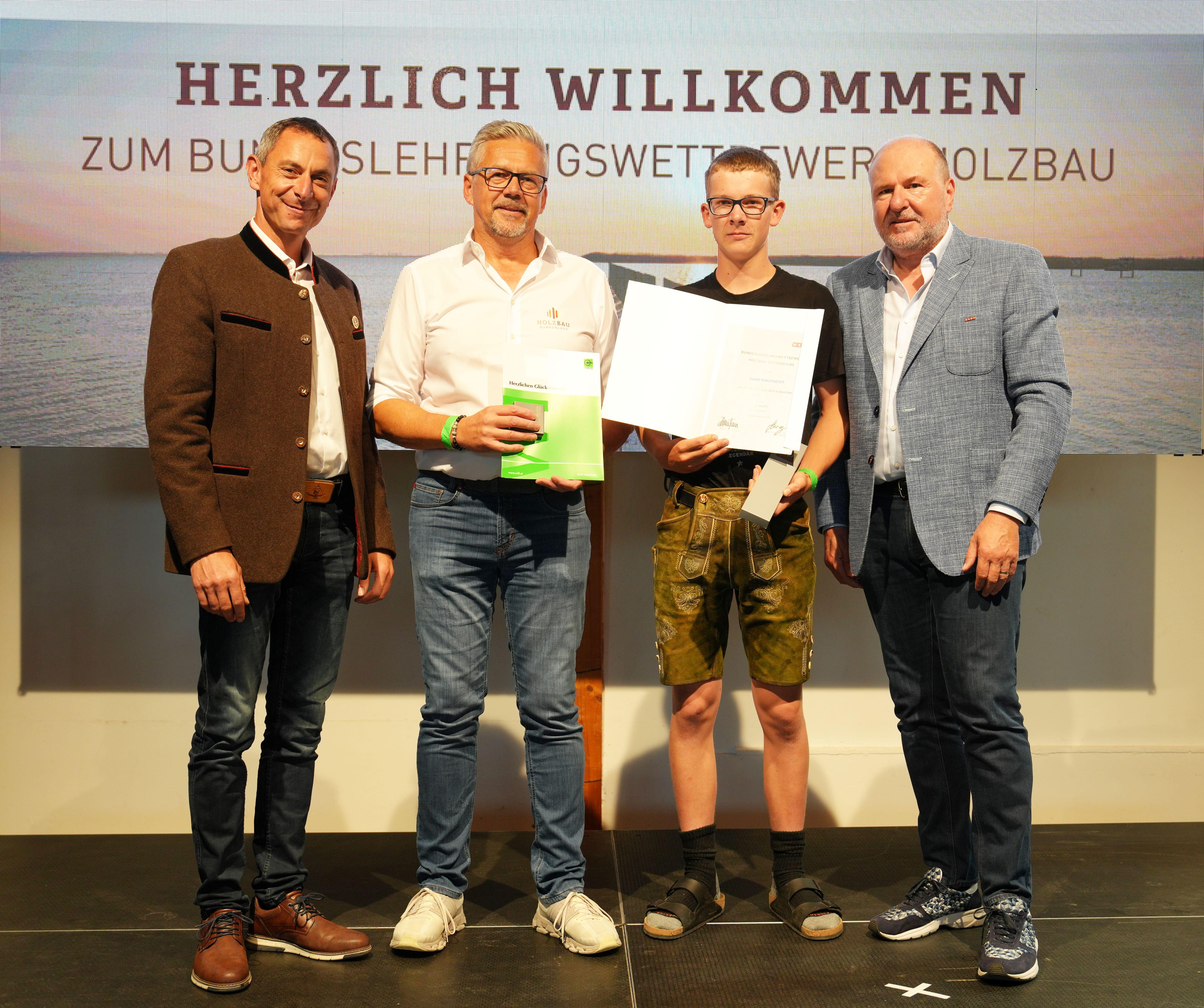 Bundessieger: Der Oberösterreicher David Pargfrieder (2. v. r.) siegt beim Bundeslehrlingswettbewerb Holzbau in Rust. Im Bild mit Bundesinnungsmeister Simon Kathrein, Landesinnungsmeister Mst. Josef Sachs und Spartenobmann KommR Anton Putz (v. l.)