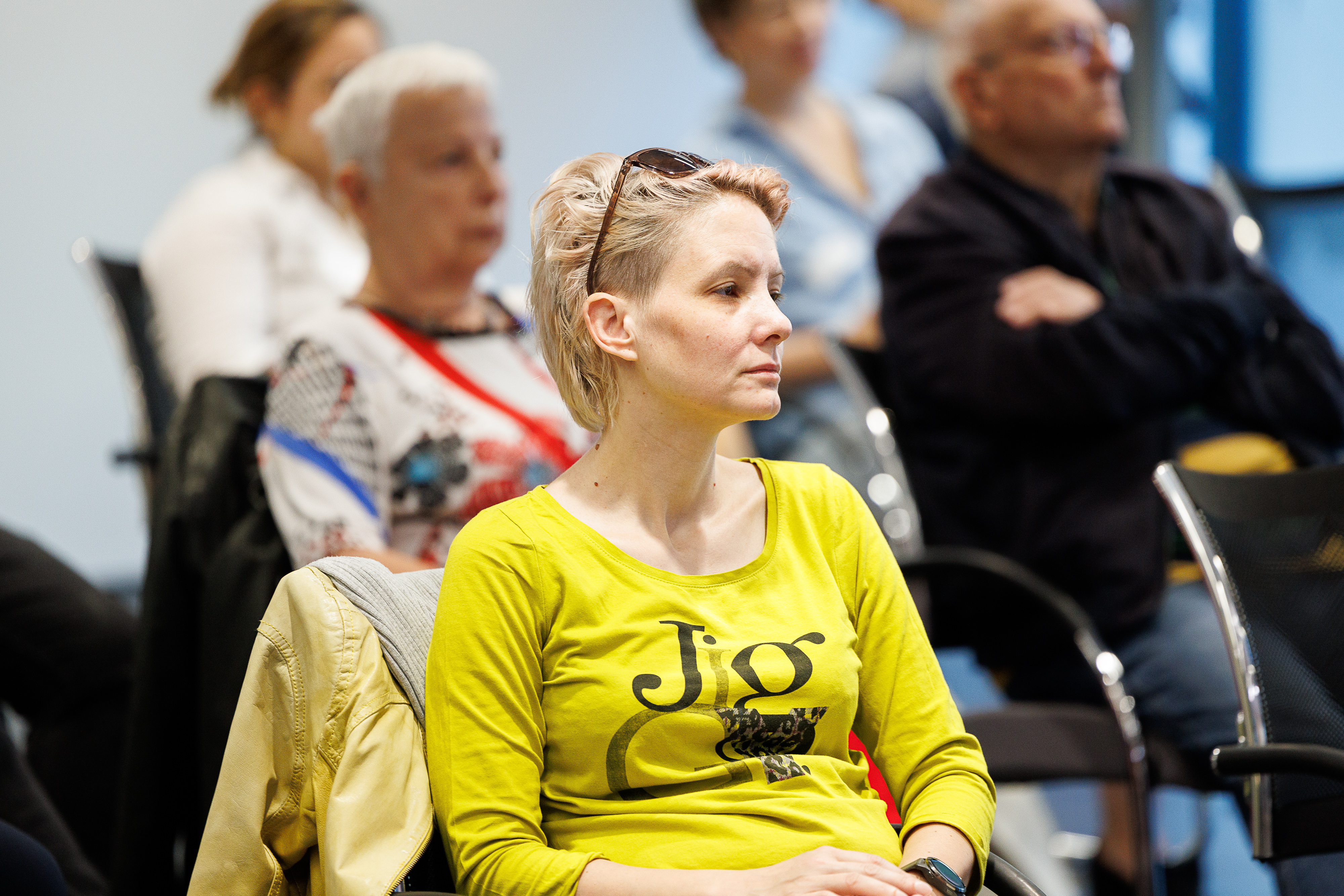 Mehrere sitzende Personen in Rückenansicht, im Hintergrund verschwommen Personen auf Bühne