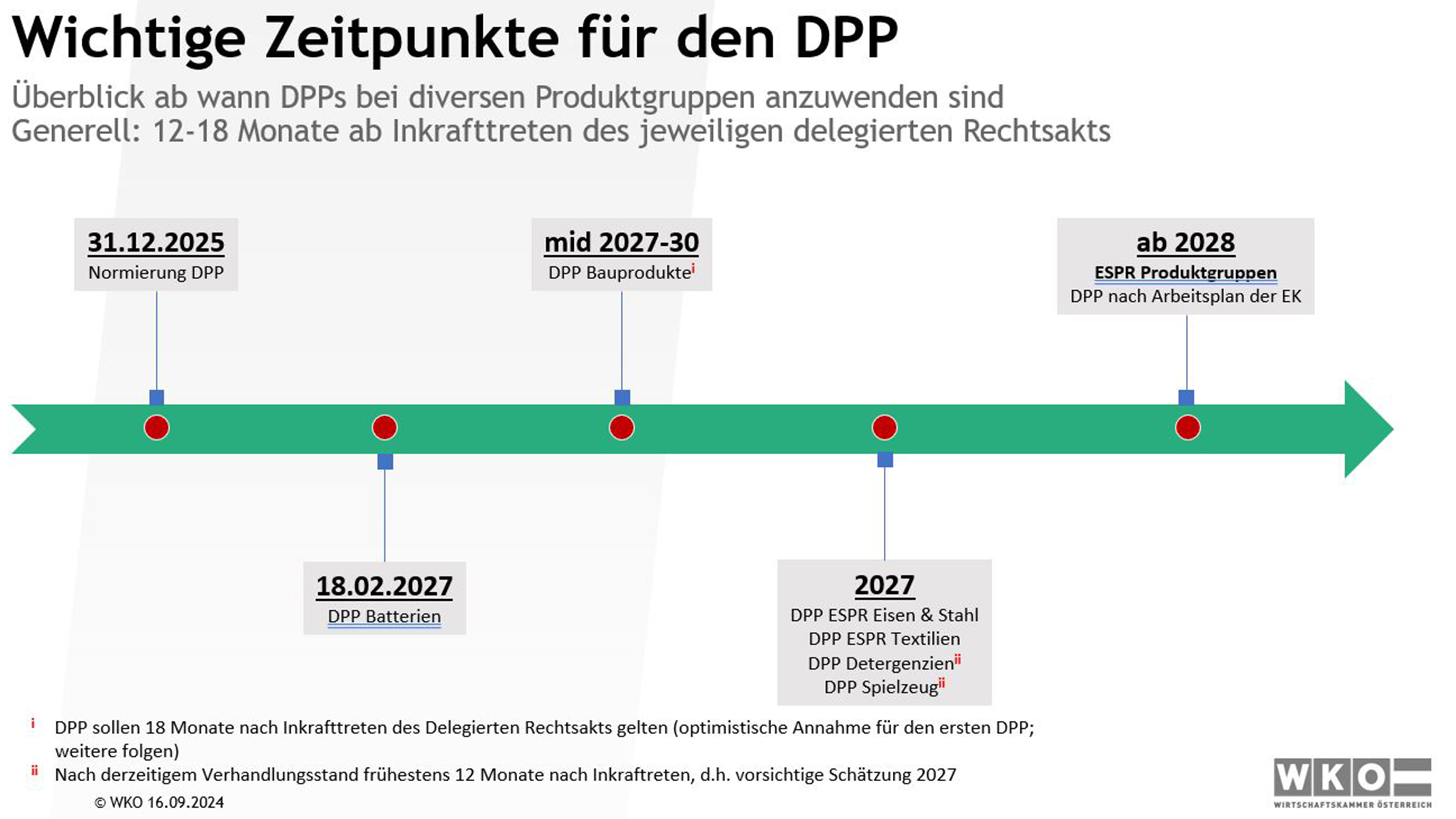 Mit Stand September 2024 ist mit der Einführung des DPP in verschiedenen Bereichen wie folgt zu rechnen: DPP Zeitstrahl.
