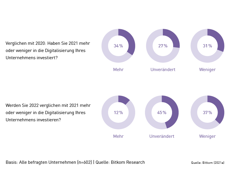 Die Entwicklung digitaler Geschäftsmodelle erfordert Investitionen, sichert aber langfristig die Existenz des eigenen Betriebs – und kann neue Potenziale in Bezug auf die Wettbewerbsfähigkeit erschließen. Auch die Coronakrise hat deutlich gemacht: Je höher der Digitalisierungsgrad eines Unternehmens, desto leichter findet es auch seinen Weg durch die Krise. Der Trend zu stärkeren digitalen Investitionen, der sich zu Beginn der Krise deutlich abzeichnete (vgl. Bitkom 2020), scheint bei deutschen Unternehmen jedoch nicht anzuhalten: 2021 investierten 34% mehr als im Vorjahr in die Digitalisierung ihres Unternehmens, doch bei 31% der Firmen gingen die Investitionen zugleich zurück. Für 2022 wollen sogar 37% der Unternehmen weniger in die eigene Digitalisierung investieren.