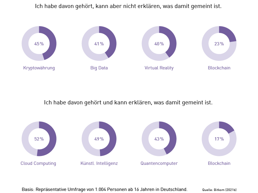 Obwohl digitale Technologien längst fester Bestandteil unserer Lebens- und Arbeitswelten sind ist ihr Bekanntheitsgrad eher gering. Fachbegriffe wie Blockchain, Quantencomputer und Künstliche Intelligenz stellen viele Menschen vor ein Rätsel und sind in weiten Teilen der Bevölkerung sogar gänzlich unbekannt – so haben mehr als die Hälfte aller Deutschen den Begriff Blockchain noch nie gehört (vgl. Bitkom 2021b). Um die digitale Transformation ganzheitlich und gesamtgesellschaftlich vorantreiben zu können, wird es künftig zentral sein, die Grundlagen digitaler Technologien allen Menschen verständlich zu machen.