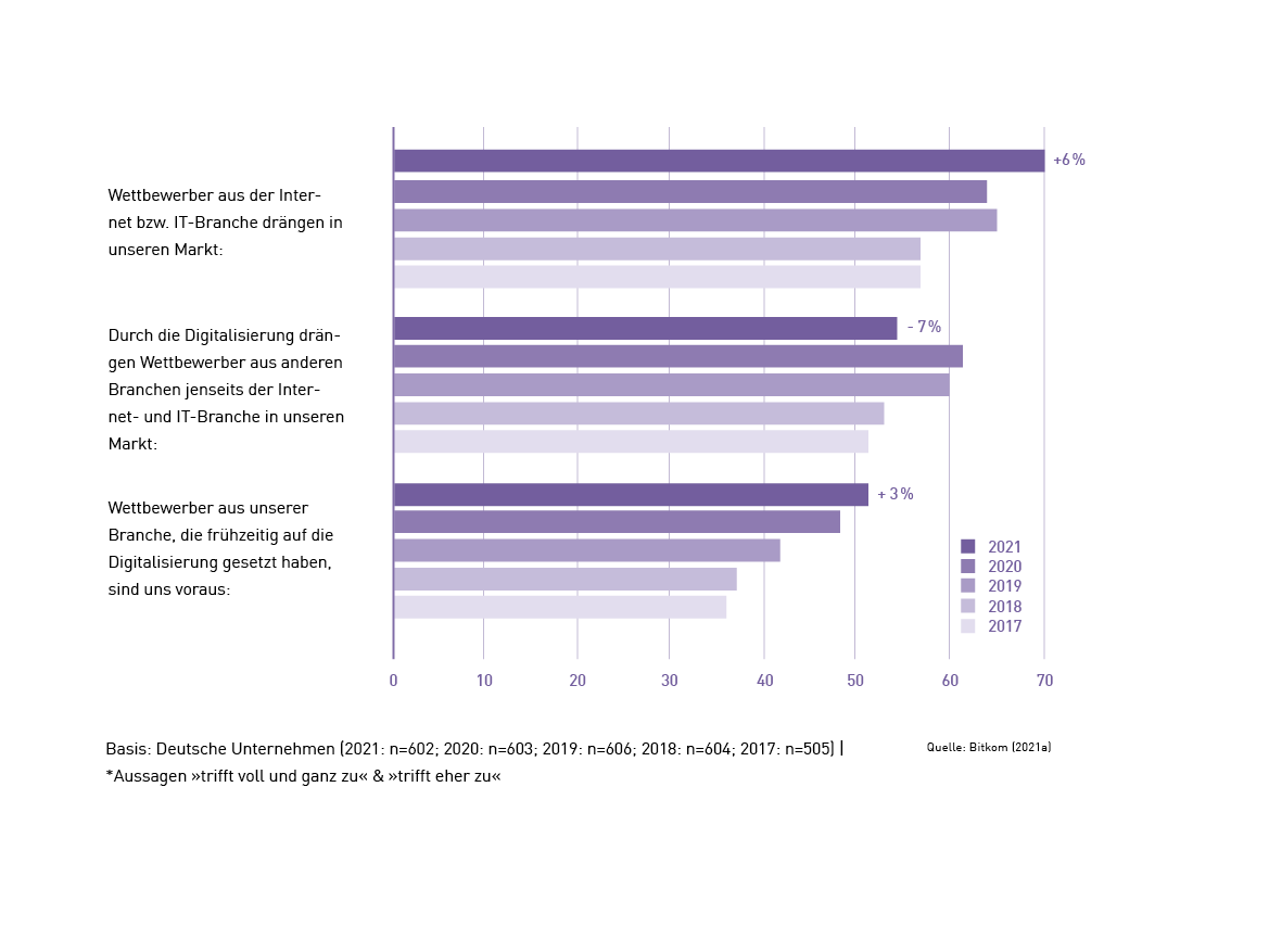 Digitalisierung wird für den unternehmerischen Erfolg immer wichtiger – auch weil sie einen steigenden Wettbewerbsdruck erzeugt, der sich durch sämtliche Wirtschaftszweige zieht: Der Grund sind meist Unternehmen aus der Internet- und IT-Branche , die auf fremde Märkte drängen und zu direkten Konkurrenten werden. Doch auch gegenüber Wettbewerbern aus der eigenen Branche, die frühzeitig auf Digitalisierung gesetzt haben, sieht sich jedes zweite Unternehmen im Hintertreffen. Wer in Zukunft wettbewerbsfähig bleiben und seine Marktposition sichern will, muss auf diesen gestiegenen Wettbewerbsdruck reagieren und agiler werden in Sachen digitale Transformation.