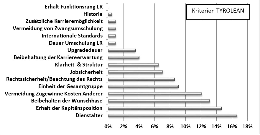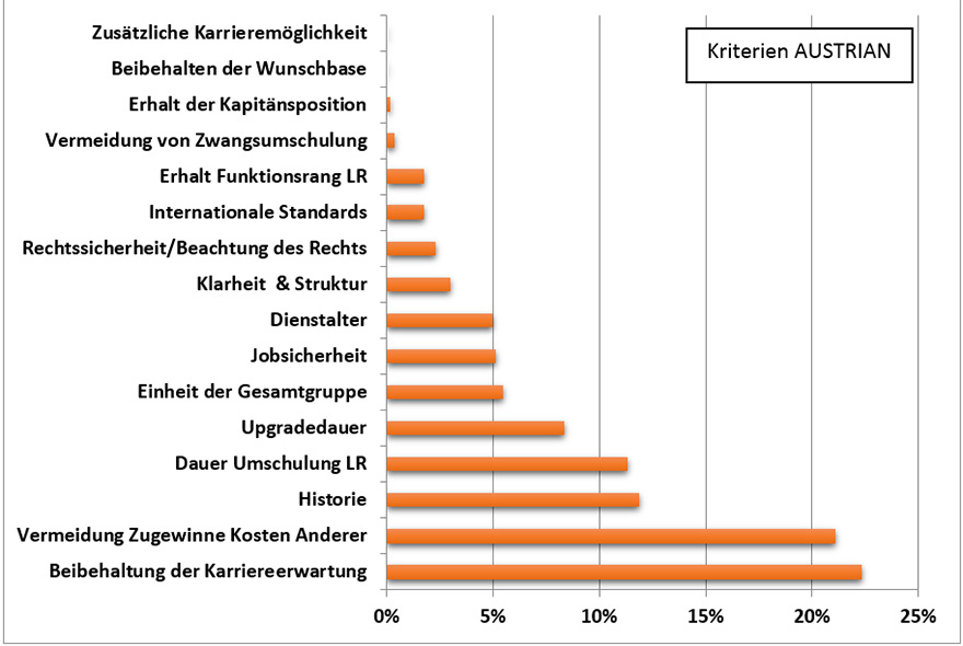 So konnten für den Großteil aller Piloten und Flugbegleiter die jeweils erwünschten Funktionen und Stationierungen erhalten bzw. sogar verbessert werden. Lediglich für rund 80 Kapitäne auf der Fokker Flotte würde sich eine ungewünschte Umschulung auf ein anderes Flugzeugmuster unter Erhalt des Kapitänsranges er-geben. Dies ergab sich aus der Ablöse der Fokker. Das entsprach zwar der Grundannahme der Karrieregruppe zum Ausgleich der Karriere Entwicklung der Vergangenheit, es wurde aber subjektiv unter den Betroffenen als ungerecht empfunden, da es die einzige Schulung entgegen der Schulungspräferenz darstellt.