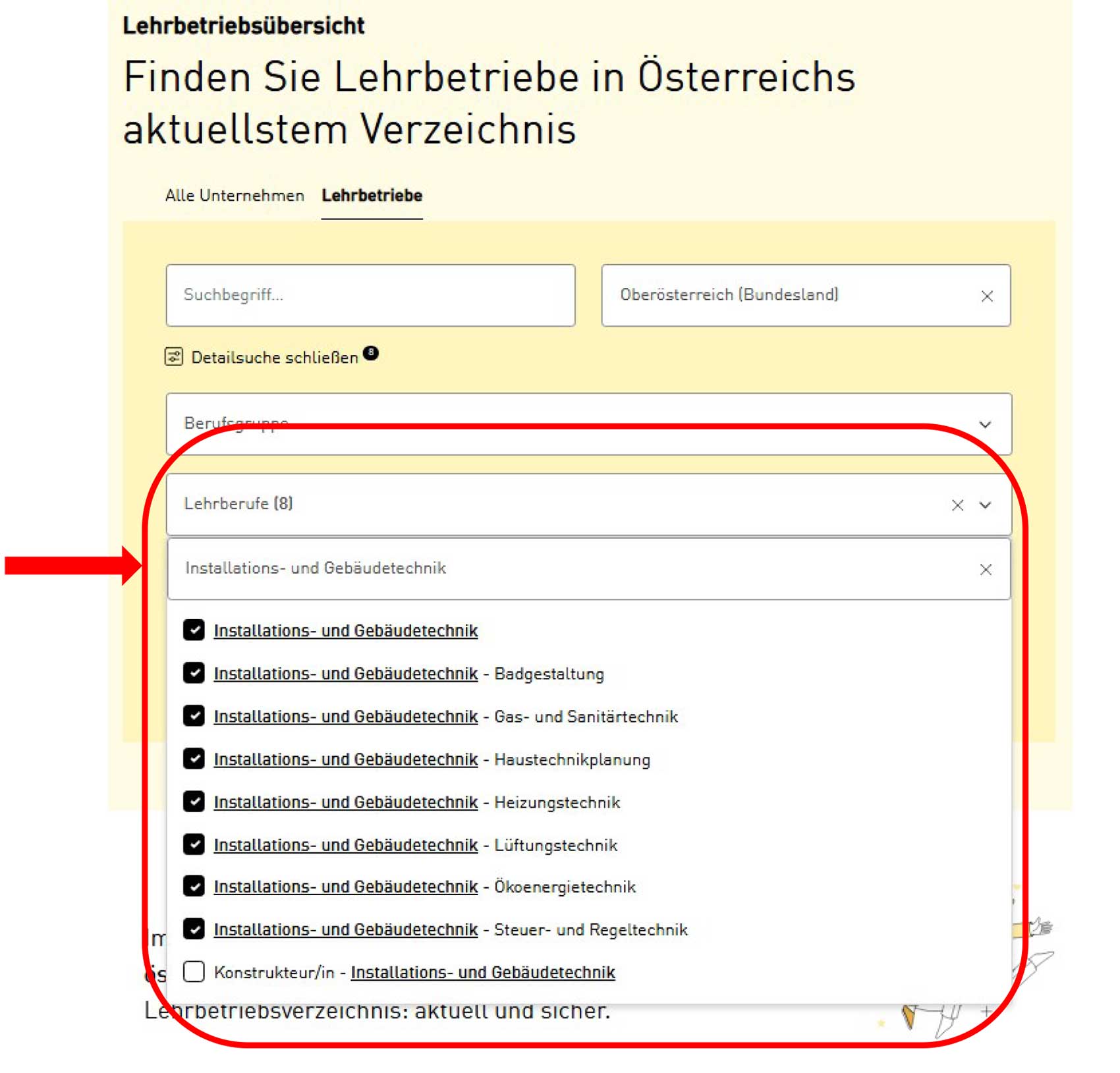 4. Im Suchfeld "Lehrberufe" Installations- und Gebäudetechnik eingeben und markieren.