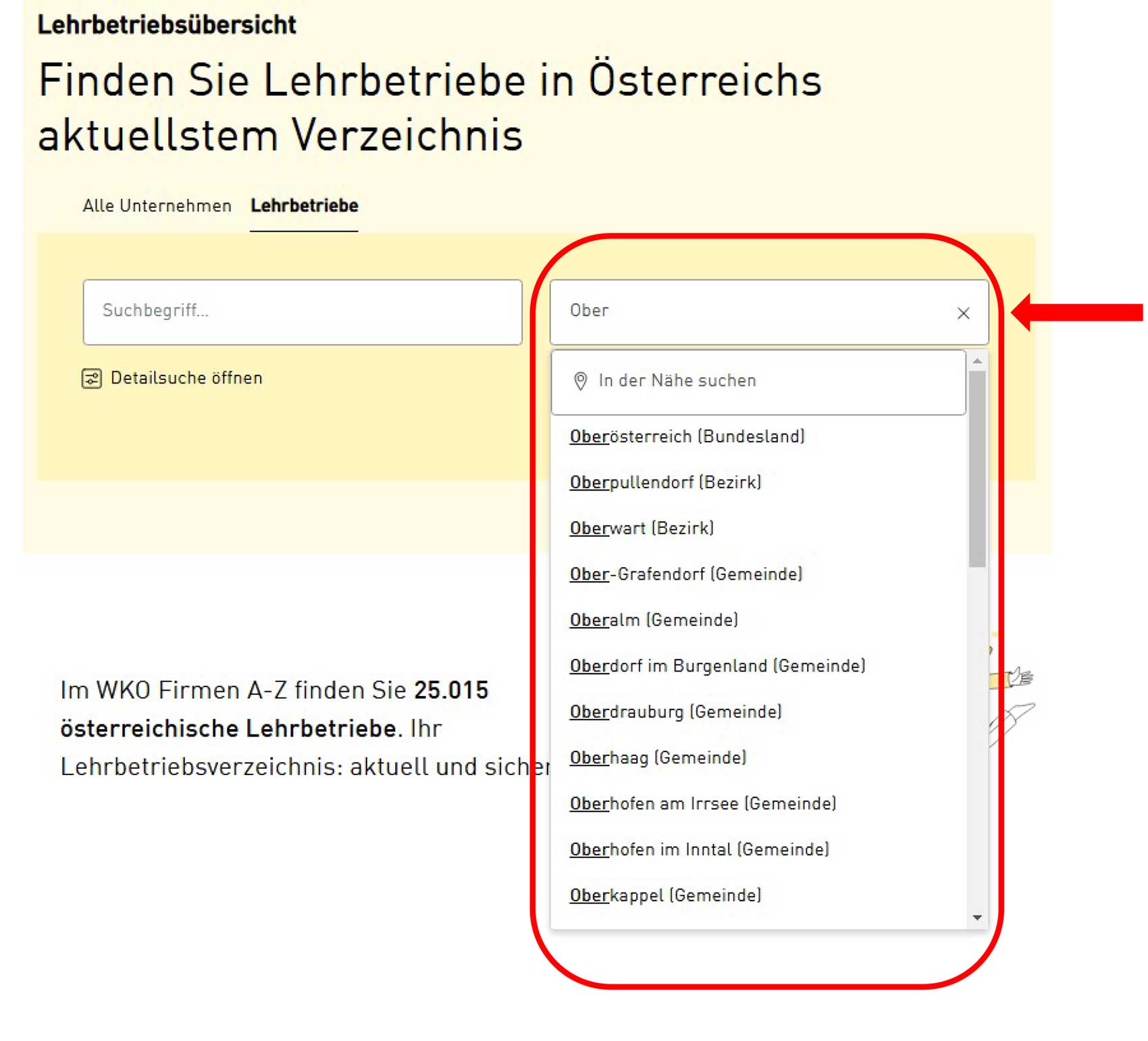 Je weiter der Standort (z.B. Bundesland) ausgewählt ist, desto mehr Lehrbetriebe werden angezeigt.