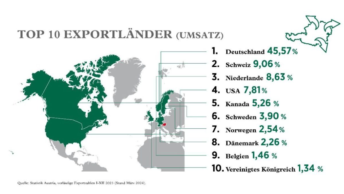 Mit Blick auf die einzelnen Exportmärkte zeigt sich ein sehr unterschiedliches Bild. Der wichtigste und sehr preissensible Exportmarkt Deutschland legte beim Wert um beachtliche 14,8 % zu und überstieg dadurch erstmals die 100-Mio.-Euro-Marke (108,6 Mio. Euro). Damit generierte Österreich dort fast die Hälfte (45,6 %) seiner Exporterlöse.