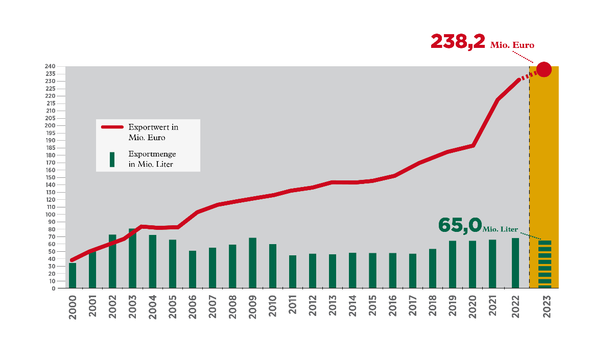 Der Exportwert stieg vergangenes Jahr nur leicht auf 238,2 Mio. Euro an (+2,7 %). Gleichzeitig zeigte die Exportmenge nach unten (-4,7 %), was auf einen deutlichen Rückgang des Fassweinexports zurückzuführen ist. Bei den Exportmärkten stach Deutschland mit einem Wertzuwachs von 14,8 % positiv hervor, bei den Produktgruppen der Weißwein in Flaschen mit einem Wertzuwachs von 7,3 %.