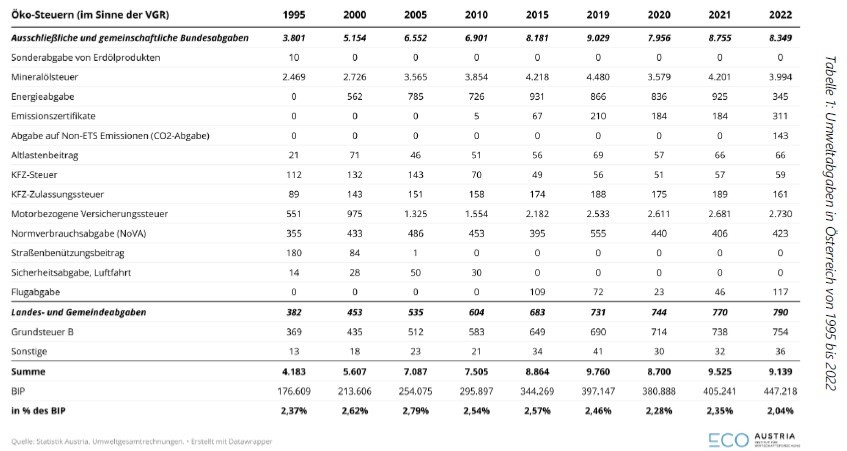 Laut einer aktuellen Studie der EcoAustria wird das Budget durch klimapolitische Ziele belastet. Die öffentlichen Einnahmen aus Umweltabgaben in Österreich beliefen sich im Jahr 2022 auf rund 9,1 Mrd. Euro. Die beiden größten Posten sind die Mineralölsteuer mit knapp 4 Mrd. Euro und die motorbezogene Versicherungssteuer mit über 2,7 Mrd. Euro.