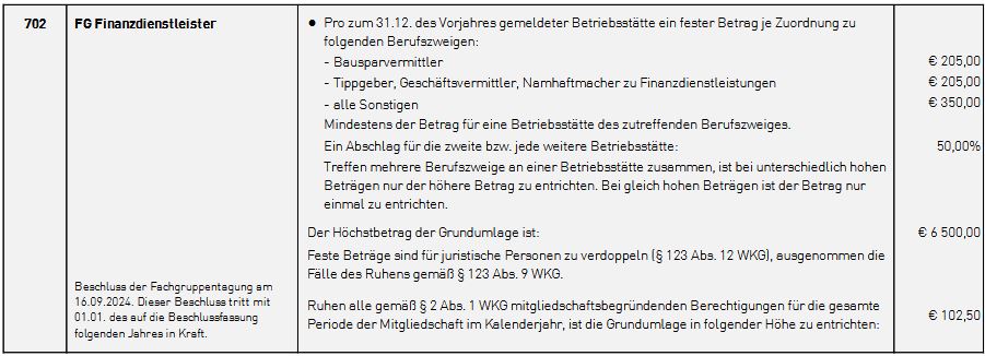 Nachstehend der aktuelle Grundumlagen-Beschluss der Fachgruppe Finanzdienstleister, gültig von 1.1. bis 31.12.2025: